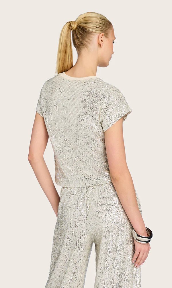 Featuring a classic crewneck silhouette and allover flexible sequins, this fully lined short-sleeve top exudes glamour. Pair it with coordinating sequin pants for a dazzling statement or with jeans for a casual yet polished ensemble.