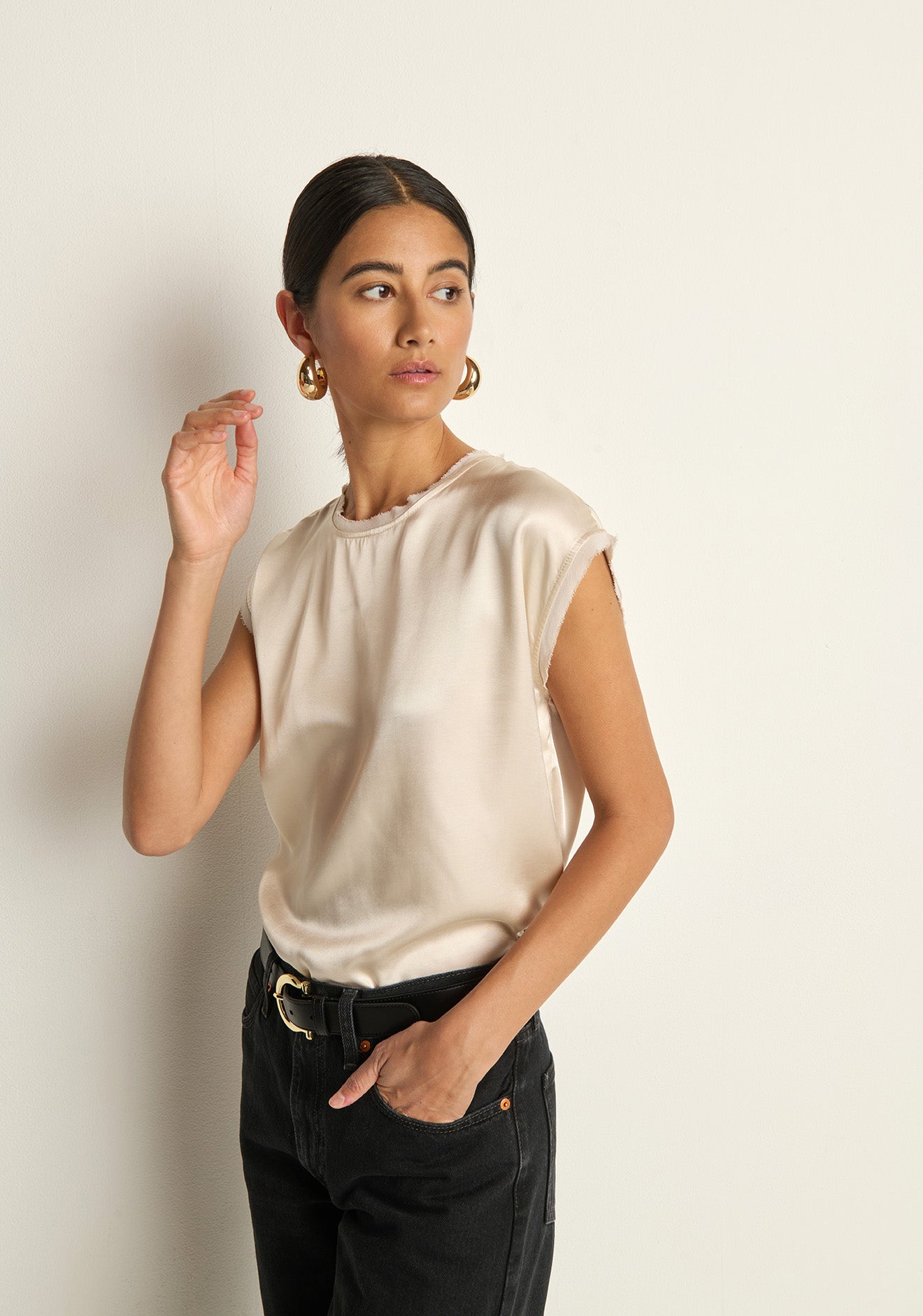 The Helen Top shines with smooth, unfussy allure—crafted from hammered satin in a boxy, cropped fit that commands attention without trying too hard. Raw edges and a sleeveless crew neckline meet a button-back keyhole closure for a look that’s effortlessly striking.
