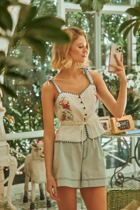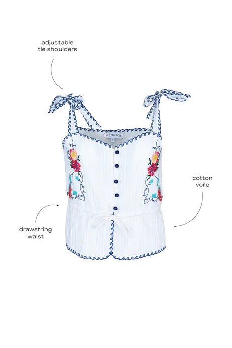 FINAL SALE. This cotton voile cami is the epitome of effortless summer romance. With a delicate button-front closure and vibrant embroidery, it captures the essence of carefree, sun-kissed days. The adjustable drawstring waist allows you to shape it just how you like, while the relaxed fit and playful details add a soft, feminine touch to your warm-weather wardrobe. We adore her paired with shorts for a look that’s as lighthearted as it is chic.