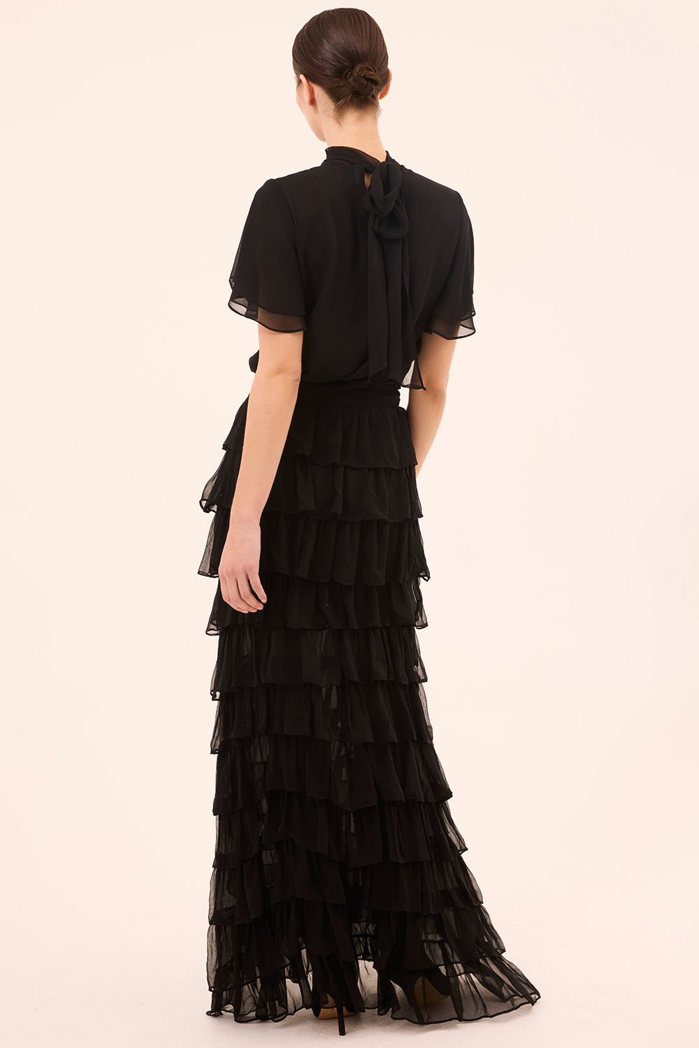Kaye is an effortless high-neck top cut from black viscose chiffon. Designed with short double ruffled sleeves and a chic tie-back detail at the neck, it’s double lined for a smooth, flattering fit. A wardrobe staple that pairs back to all of our skirts and pants or dress down with jeans.