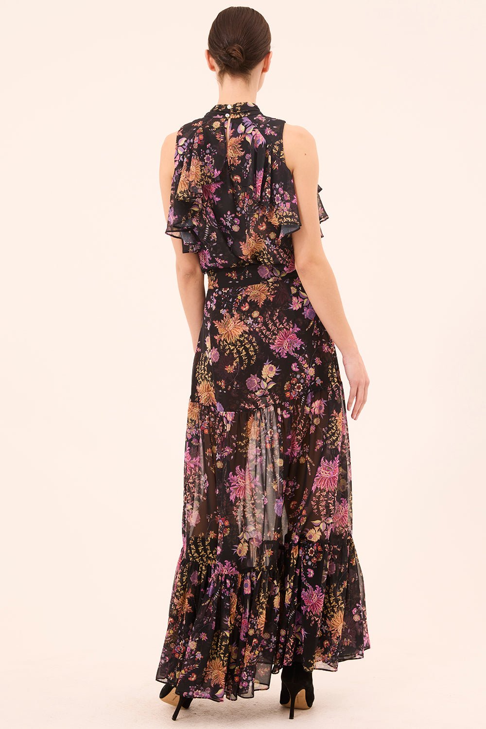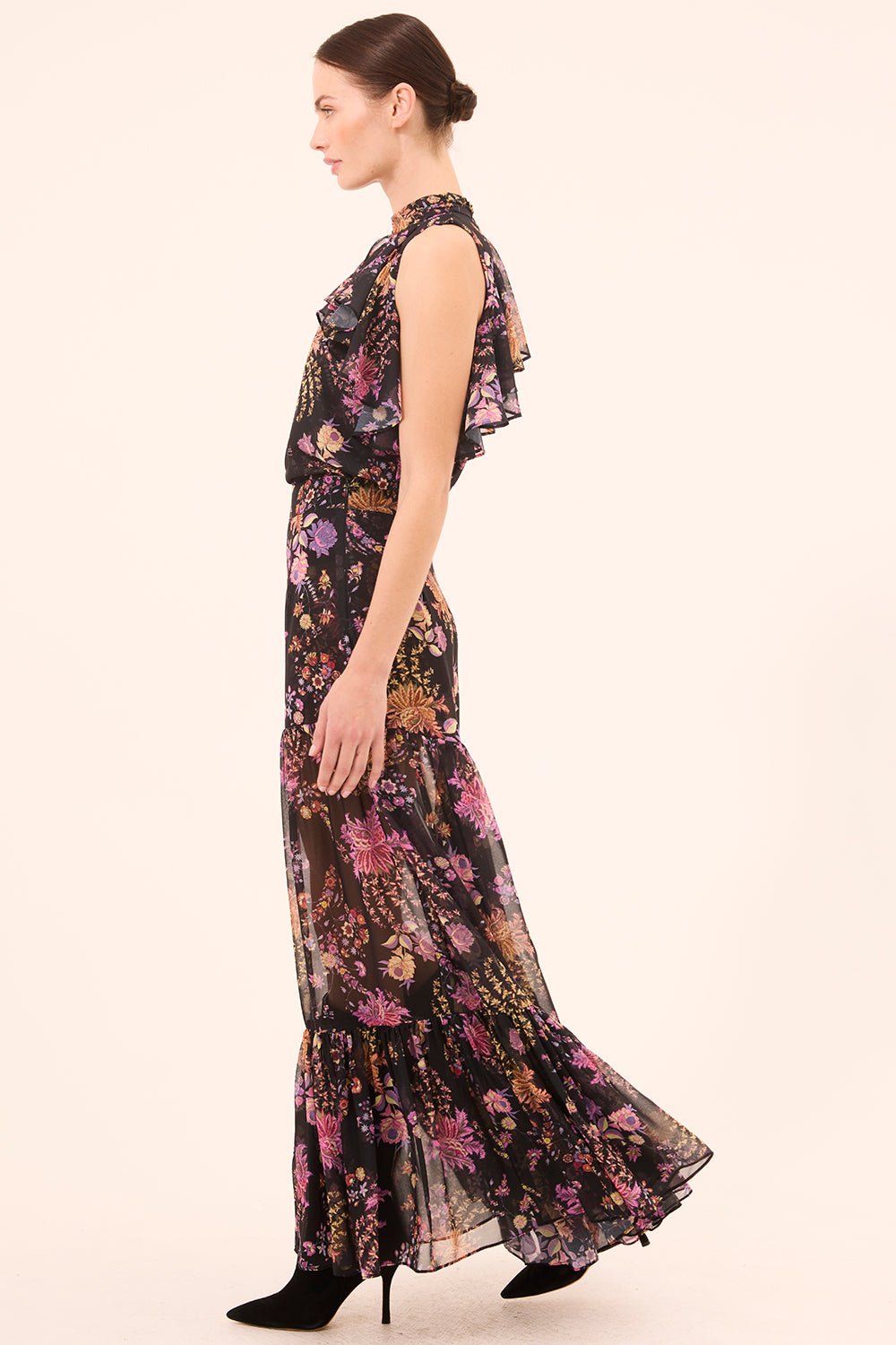 The Kyra top is a romantic sleeveless silhouette cut from our beautiful Dusted Cluster floral chiffon. Designed with a high neckline and double button keyhole back closure, this style features delicate ruffle detailing that cascades from neck to back. Pair with the coordinating Mavi skirt for an effortlessly elegant set, or dress down with wide-leg denim for a chic daytime look.