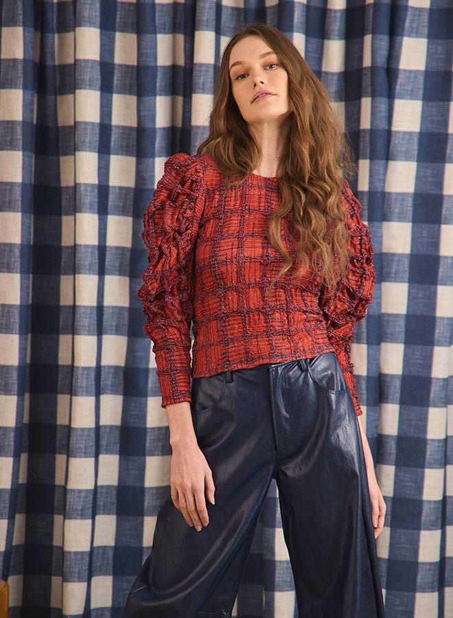 The Natalie Top is a striking silhouette that plays beautifully with volume and texture. Crafted from Italian embossed viscose woven with a subtle metallic thread, it features a cropped crew neckline and an elegantly fitted bodice balanced by dramatically full sleeves. A back zipper closure keeps the finish clean and refined.