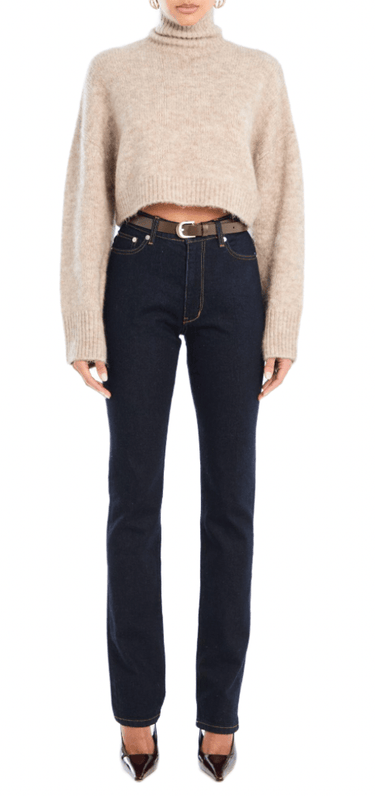 Cropped, long sleeve turtleneck sweater. Shown here in Desert.