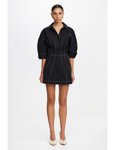 A modern take on classic shirting, the Burwell Mini Dress in Black pairs structure with statement design. Featuring an exaggerated sleeve silhouette and contoured panel stitching, this crisp mini is tailored for day-to-evening styling.