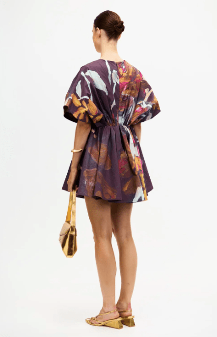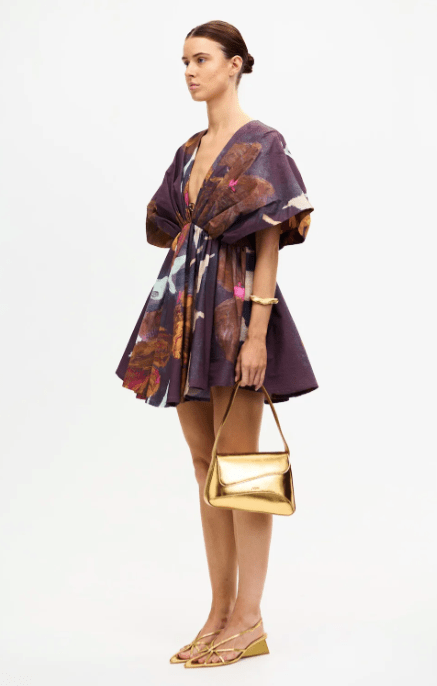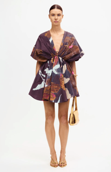 The Northam Mini Dress in Cocoa Canvas captures Acler's signature blend of artistry and refinement. This sculptural silhouette is expertly crafted from a woven cotton blend, highlighted by a unique print and a-line skirt detail. A deep v-neckline and structured shoulders, are complemented by striking gold organic ring hardware at the centre front. Fully lined for comfort and structure, this piece is designed for elevated occasionwear and contemporary event styling.
