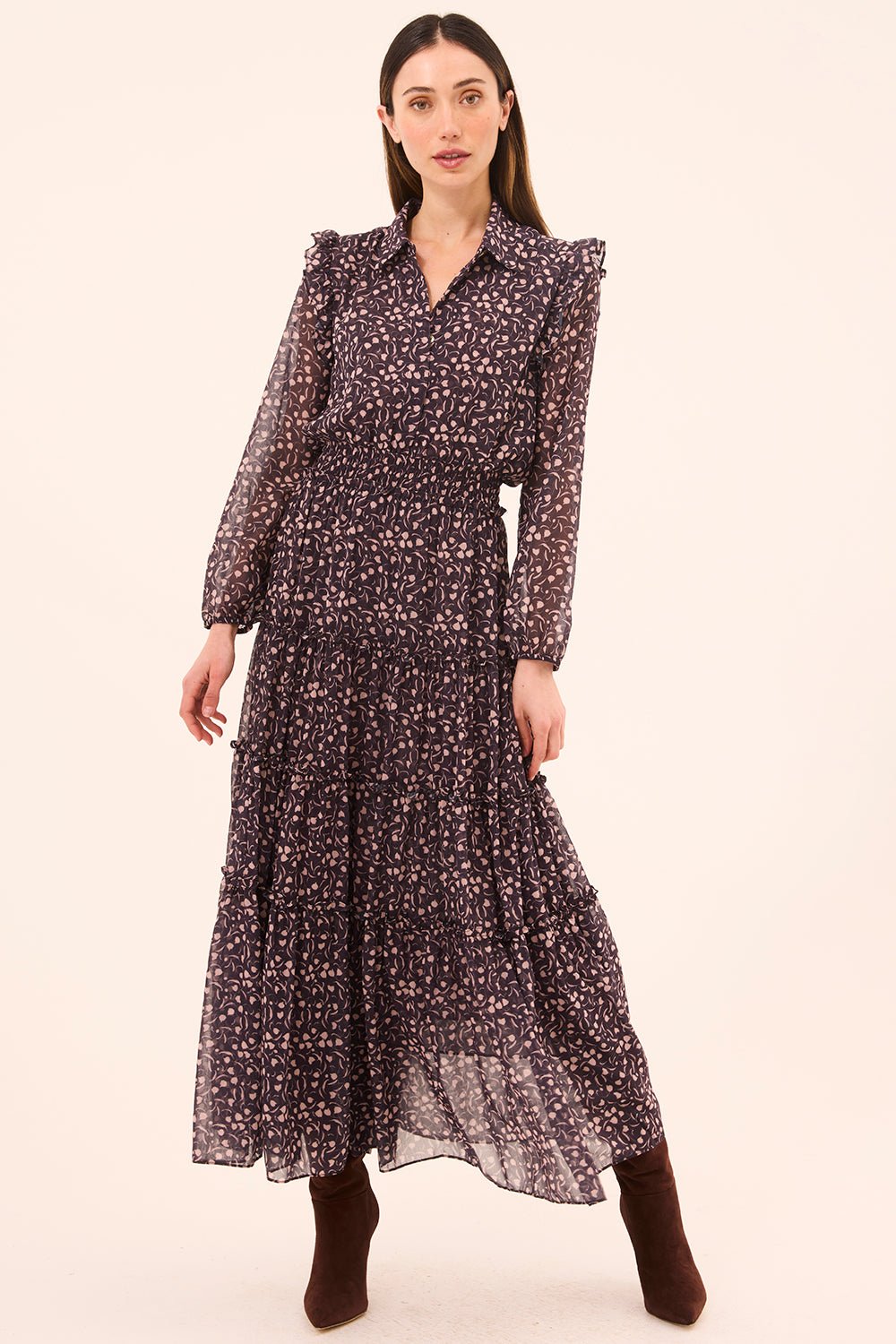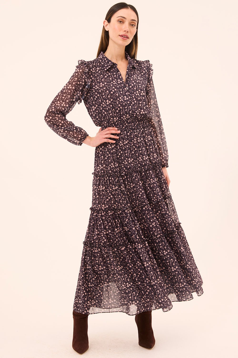 Misa universally flattering Ahreana returns for fall in a Tulipina-printed chiffon with the perfect autumn palette. This feminine take on the shirt dress features a covered button placket through the bodice and an elasticated waist for comfort and shape. A fold-over collar and delicate ruffle shoulders frame the long semi-sheer sleeves, while a back placket ruffle adds subtle charm. The bodice and skirt are self-lined, cascading into a tiered, ankle-grazing silhouette—timeless and versatile, ready to pair with everything from boots to strappy heels.