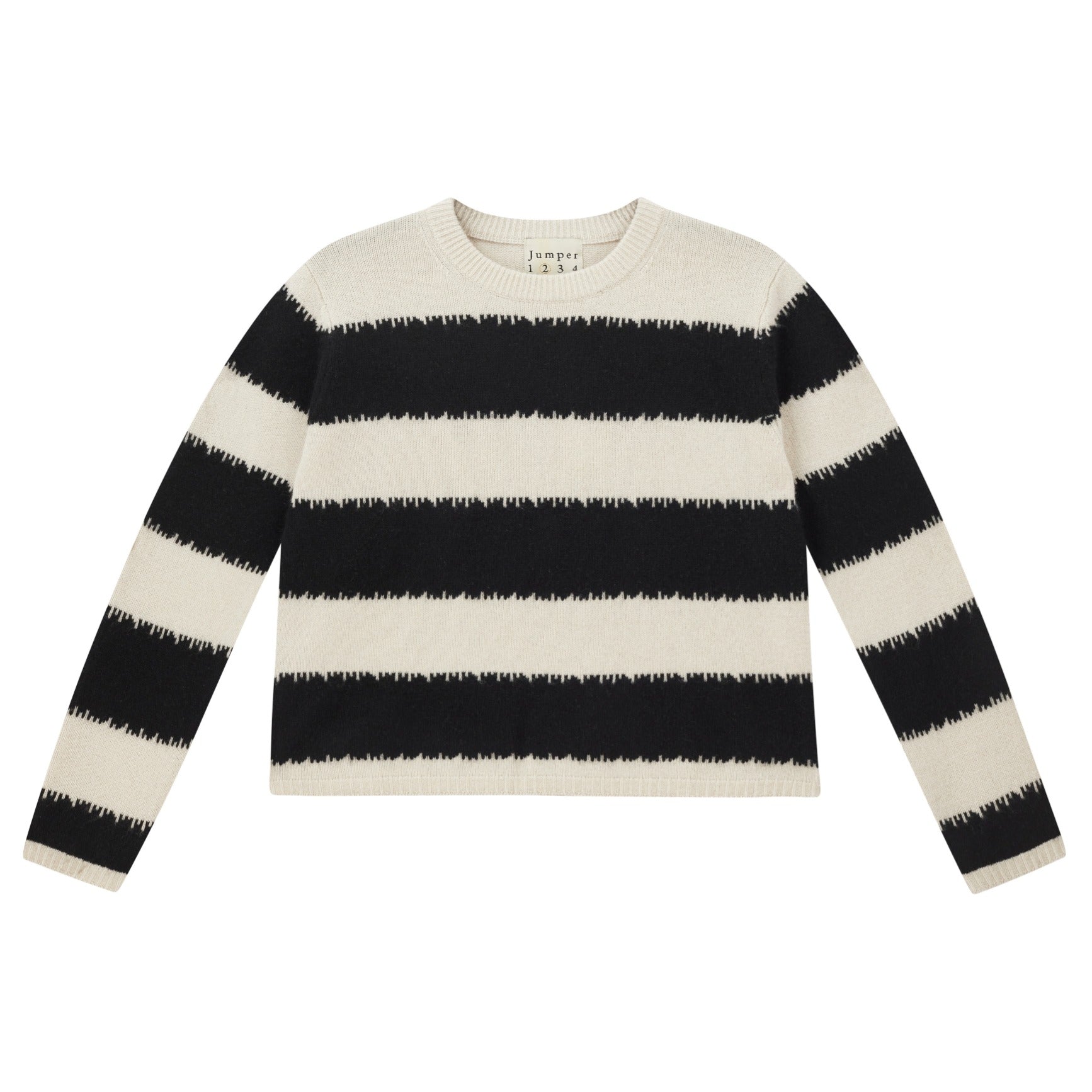 Jumper 1234 cashmere jumper. Stone and black 'broken' stripe crew neck cashmere jumper. Also available in navy and camel. True to size and slightly cropped, we are delighted with this update on a classic stripe.