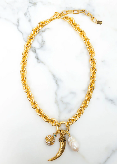 The Kaiden Necklace boldly blends striking elements with elegance. Featuring a large open ring as its centerpiece, it showcases a lustrous freshwater baroque pearl charm, a textured Italian horn charm, and a royal scepter charm lavishly encrusted with faux pearls. Complemented by textured rondelle charms, this daring piece commands attention and adds an edgy sophistication to any outfit.24K Gold Plate, Lobster Claw Closure. Proudly Handcrafted here in the U.S.A.