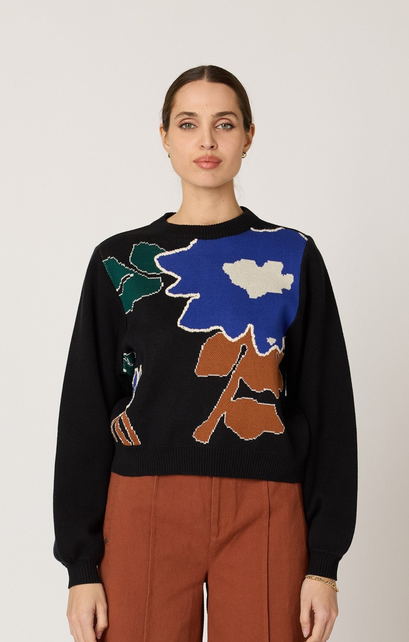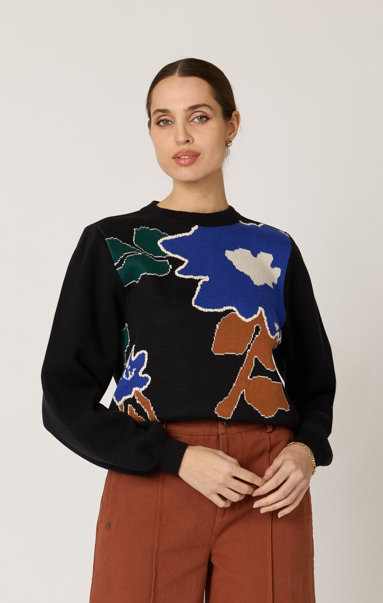 Make a statement with the Emory Sweater, where artful design meets effortless comfort. Crafted from a soft, mid-weight knit, this standout piece features a bold abstract floral pattern in earthy tones of blue, brown, and green that pop against a rich black base. The relaxed silhouette, ribbed trims, and slightly ballooned sleeves create a modern yet cozy feel — perfect for chilly days or sunset strolls.Style it tucked into your favorite denim or layered over a dress for a laid-back yet elevated look.