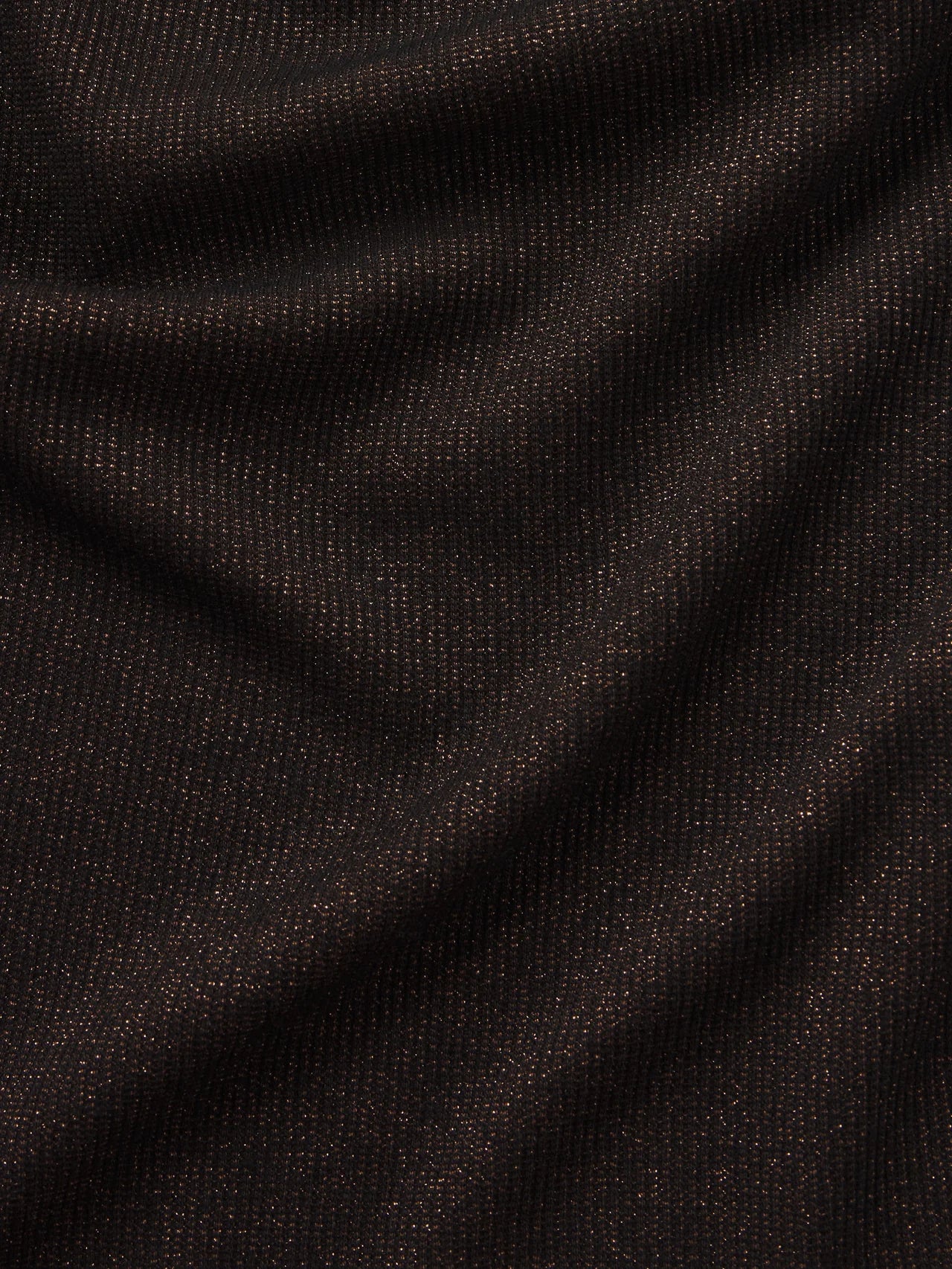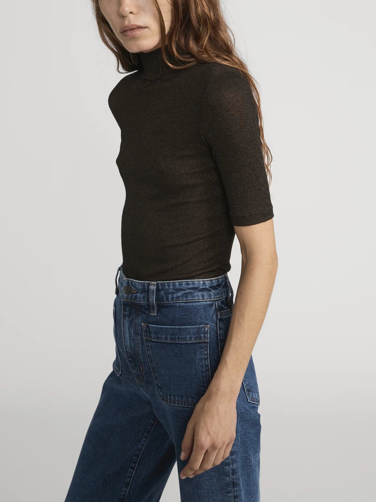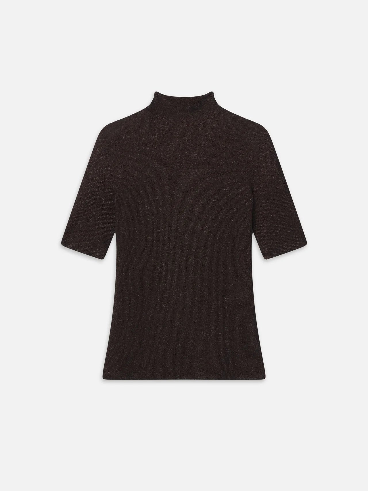 The Lurex Mock Neck Tee is crafted from a soft rib knit infused with subtle metallic shimmer, offering a fitted silhouette that transitions effortlessly from day to evening.