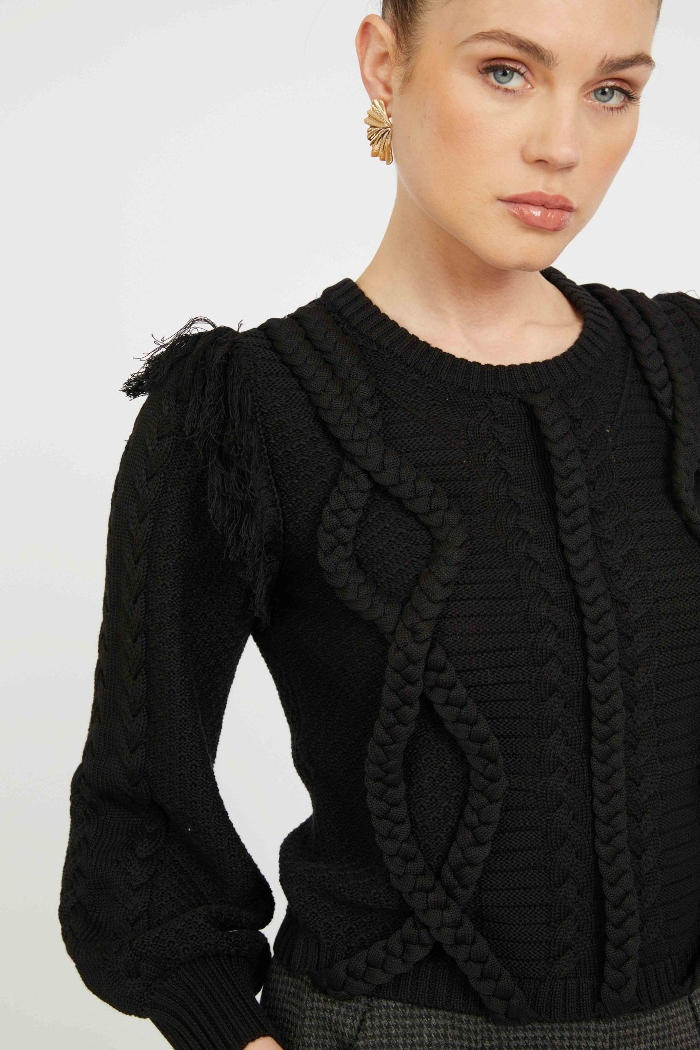 Isadora Sweater in black is a cozy knit style designed for fall. It features a relaxed silhouette with soft blouson sleeves, offering comfort and effortless style.