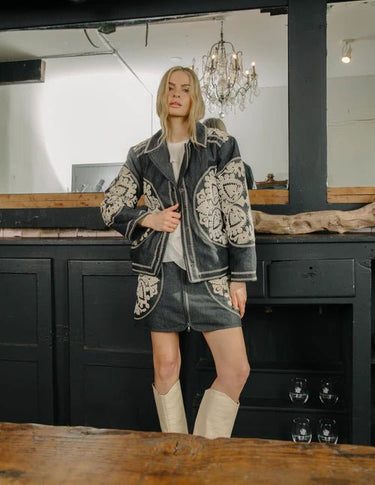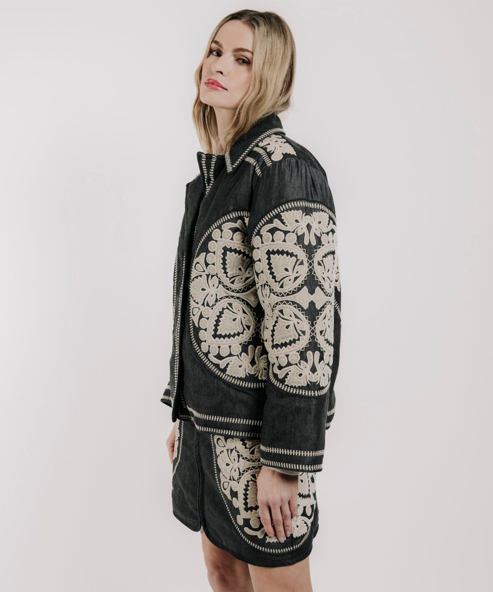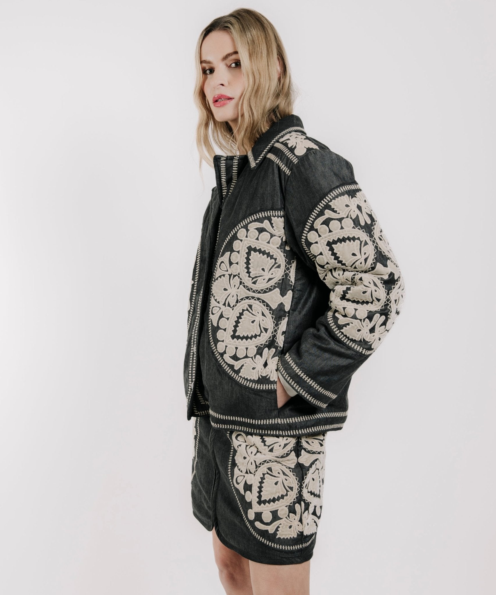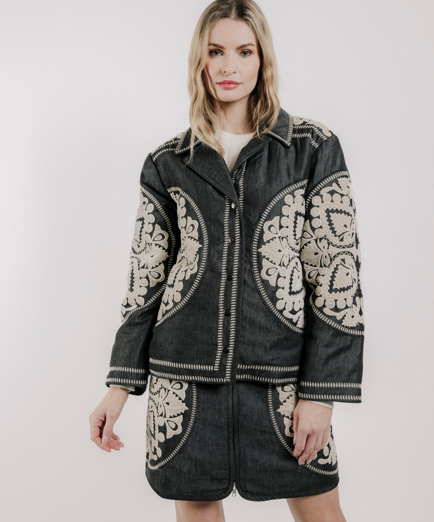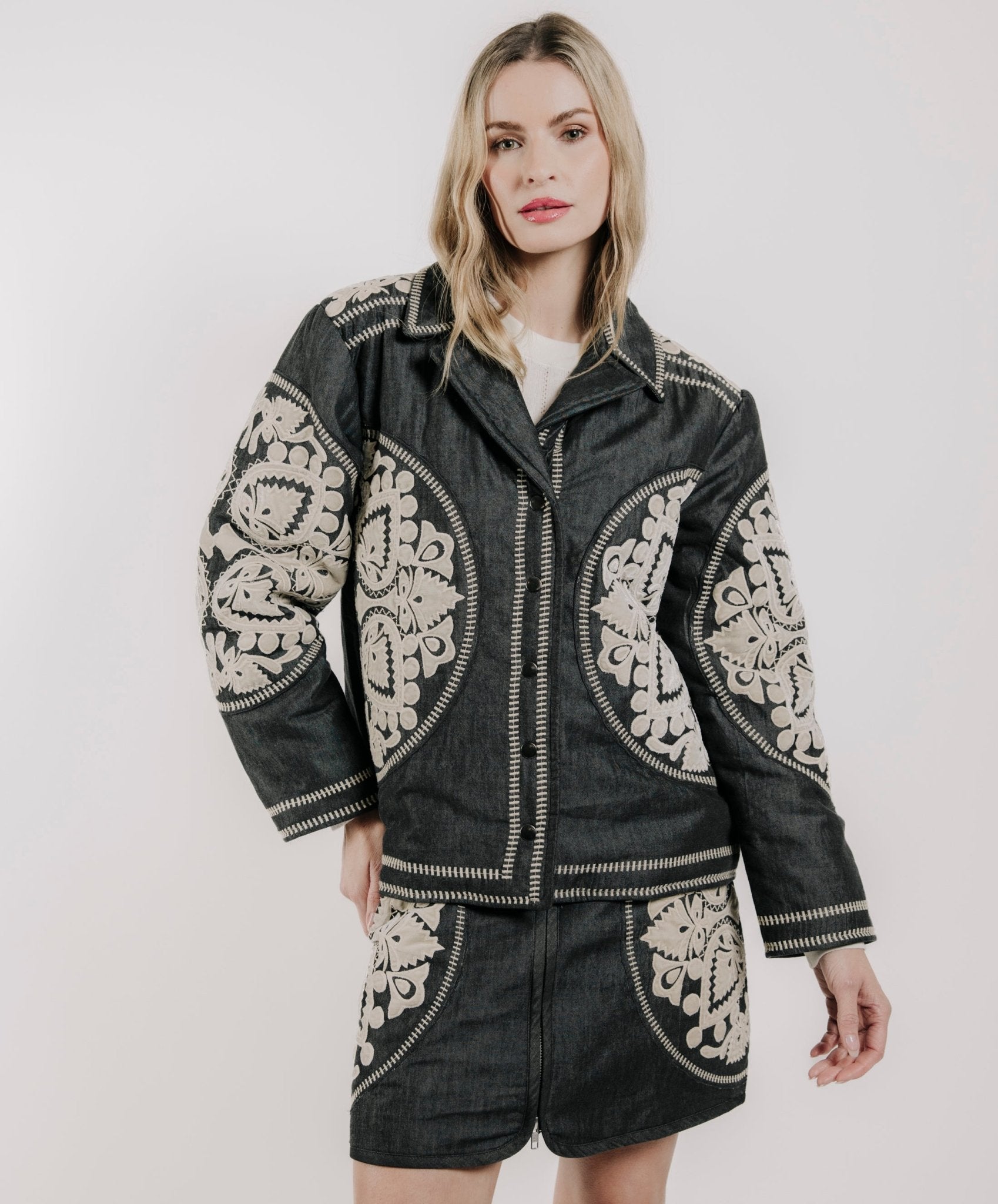 The Jamie Jacket is a quilted charcoal denim button-up, adorned with enlarged velvet ivory applique in striking circular motifs. Featuring a structured silhouette, classic collar, and front snap closure
