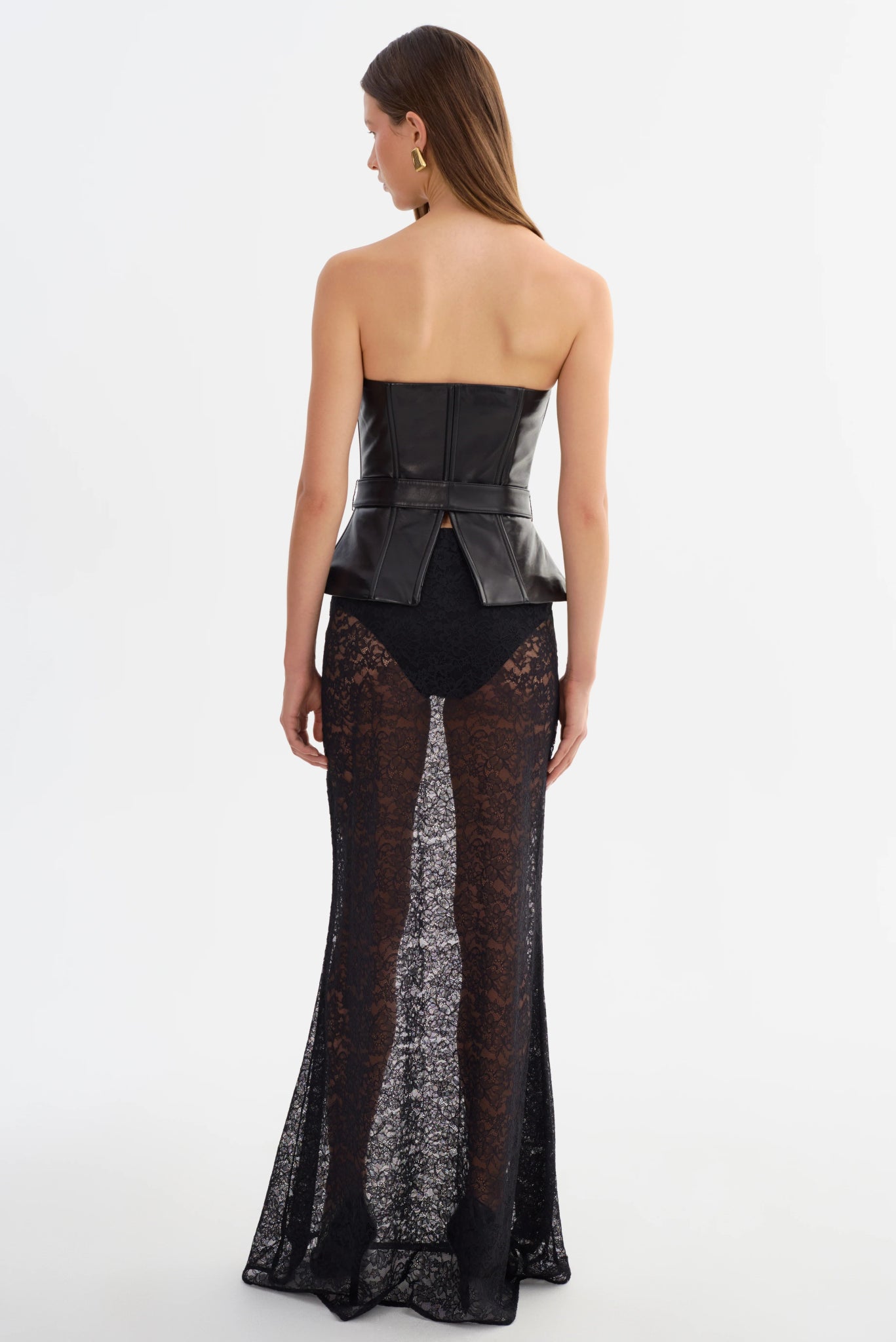 The CALA Leather Bustier redefines structure with a sleek corset-inspired silhouette. Featuring an asymmetrical neckline and hemline, boning throughout, and a removable belt, it brings both edge and refinement to evening styling. Finished with a hidden side front zipper closure, this fully lined bustier is designed for bold statement dressing.