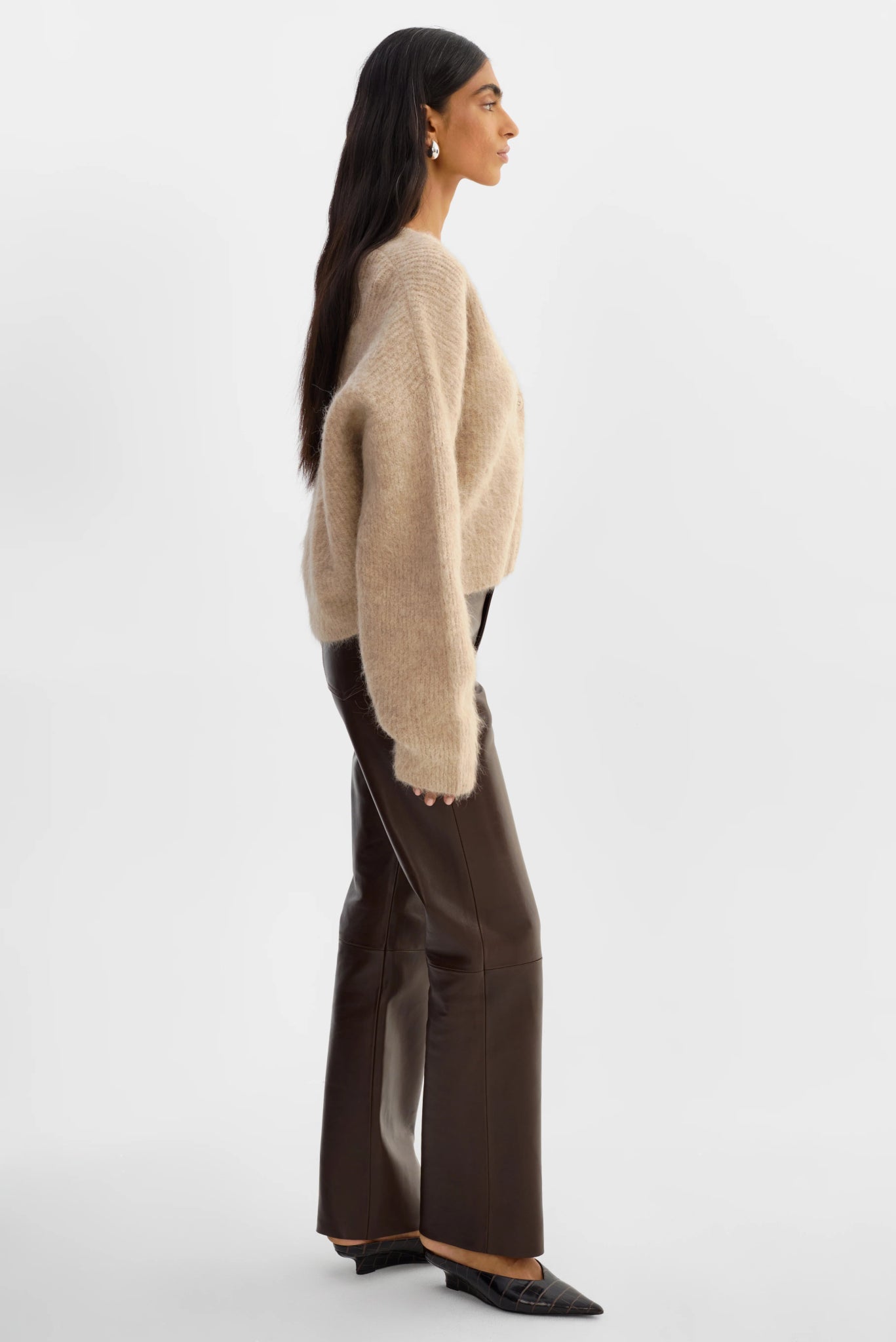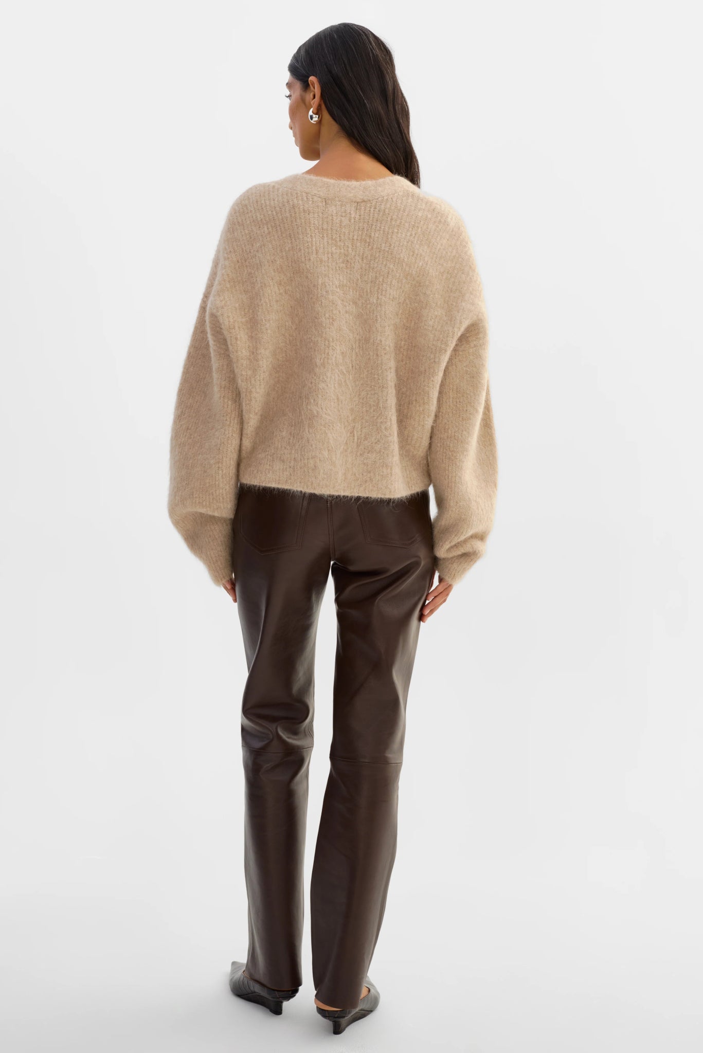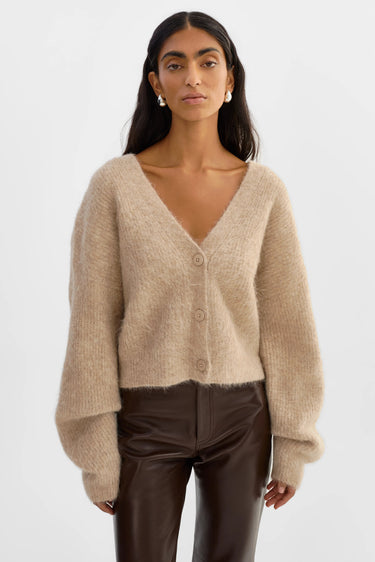 The MINNIE Knit Cardigan blends softness and structure in the most effortless way. Made from a cozy brushed alpaca knit, it features a deep V neckline, dropped shoulders, and a slightly cropped silhouette. Finished with tonal buttons and wide sleeves, it's your new go-to for layering with ease and texture.