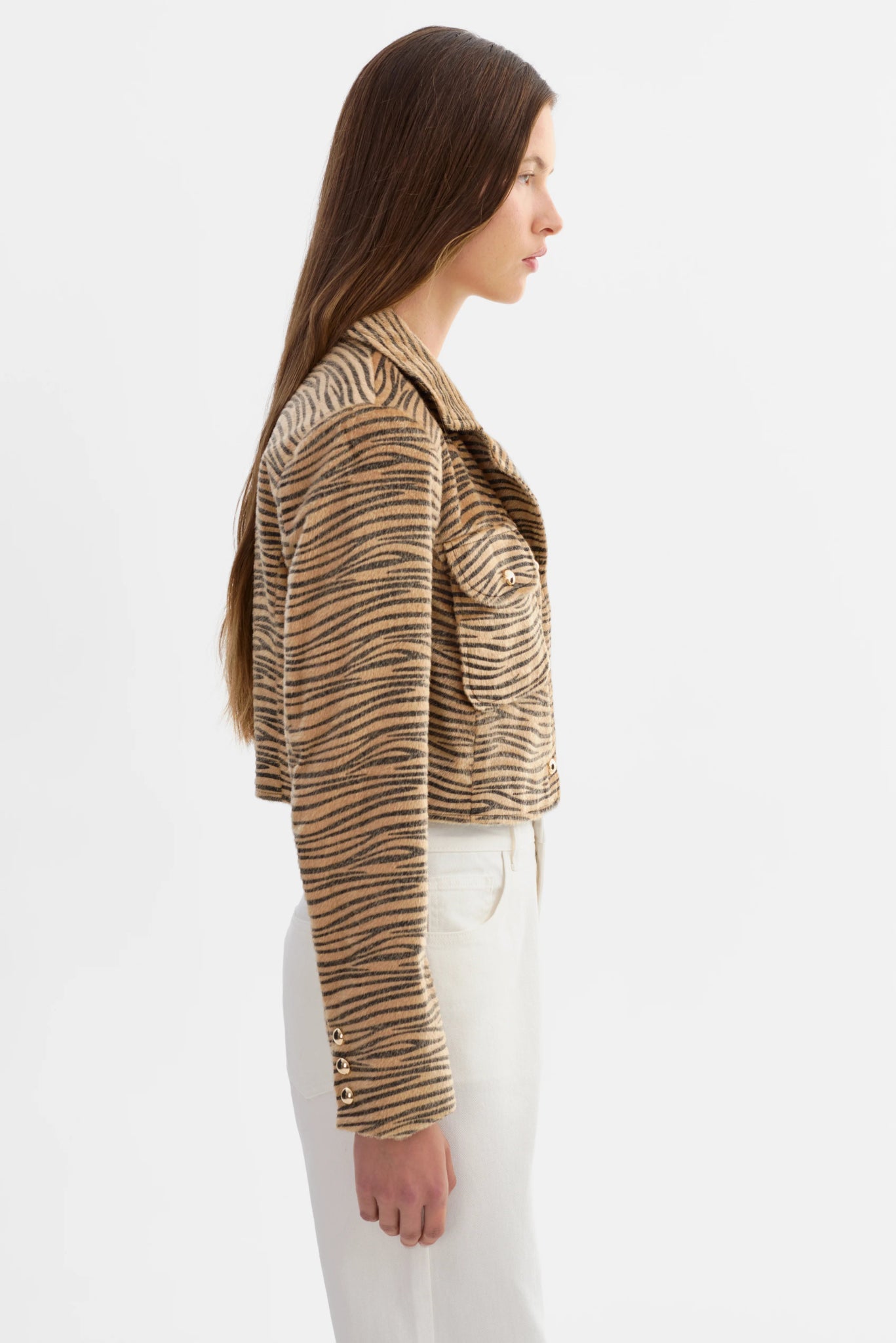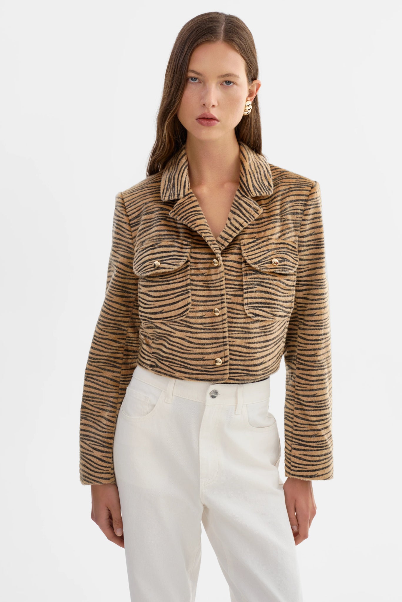 The JAYLEE Jacket offers a refined take on a classic silhouette. Crafted in faux hair tiger print, it features a notched collar, gold snap closures, and a cropped boxy fit for structured polish. Pair it with the OLEXA Skirt for a coordinated set that makes a confident, modern statement.