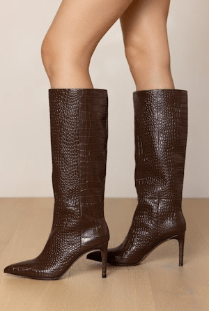 Step into bold style with the Lana Wilkinson Huw Knee-High Boot in rich chocolate croc-embossed leather. These boots bring a playful edge to any outfit, pairing statement texture with a sleek silhouette that hugs your legs. Perfect for adding a bit of fierce flair whether you're hitting the streets or heading out for an adventure. Elevate your shoe game with a touch of wild sophistication!