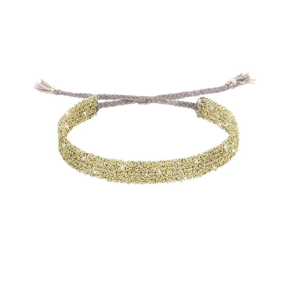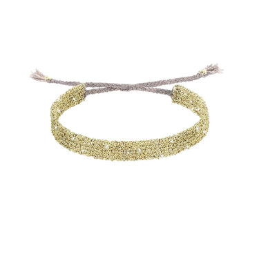Woven bracelet made of gold-finished fine 925 Sterling silver chains and grey silk yarn.