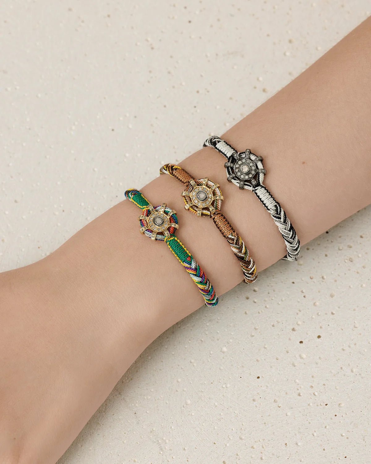 Macramé bracelet made from a set of silk yarns in dominant shades of caramel and brown. At its center, a delicate sun motif in 925 Sterling silver with a gold finish, set with a Polki diamond and mini irregular diamonds, brings a luminous note.
