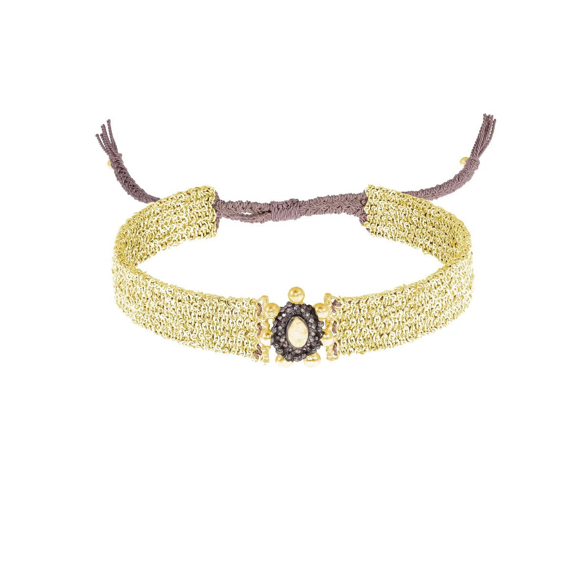 Woven bracelet in 925 Sterling silver with a gold finish, crafted from chains and grey silk yarns. It is adorned with a round medallion set with a solid silver stone, mini diamonds, and round motifs in gold and ruthenium finishes.