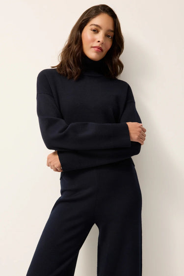 An oversized structured knit that balances ease and polish, the Emmy sweater in deep Navy brings modern sophistication to cold-weather dressing. With its soft mock neck, clean lines, and subtly slouchy fit, it drapes effortlessly while maintaining its shape.
