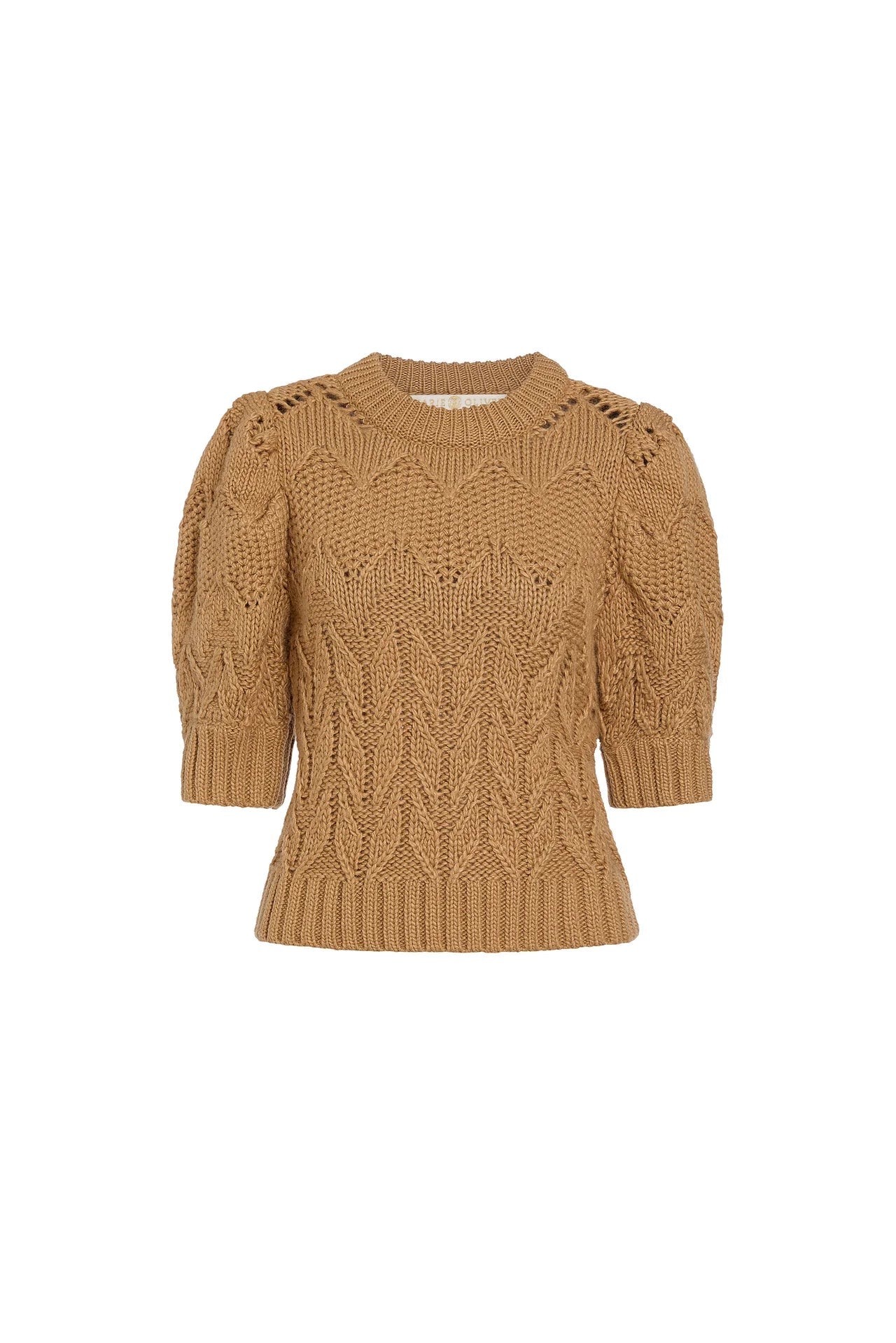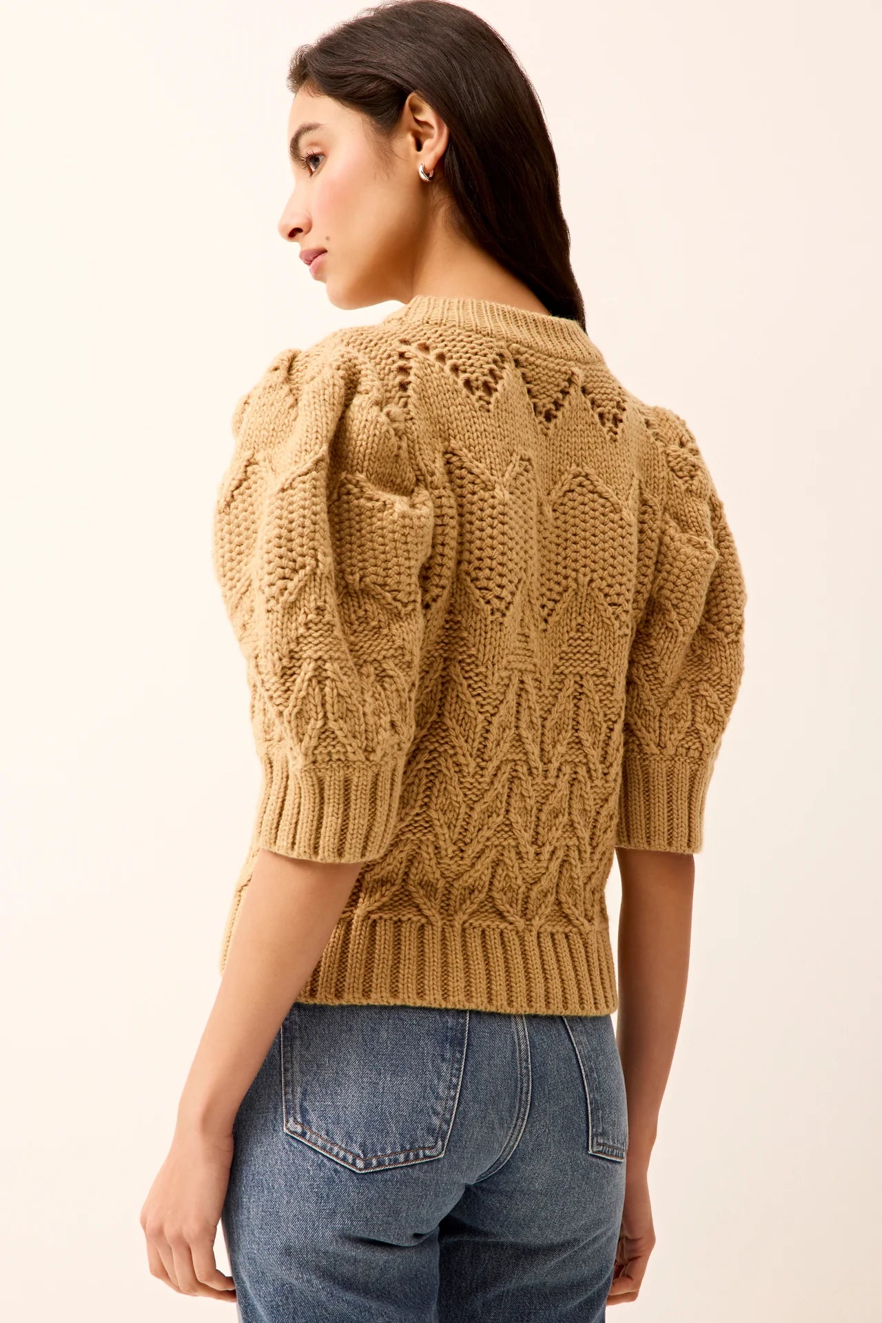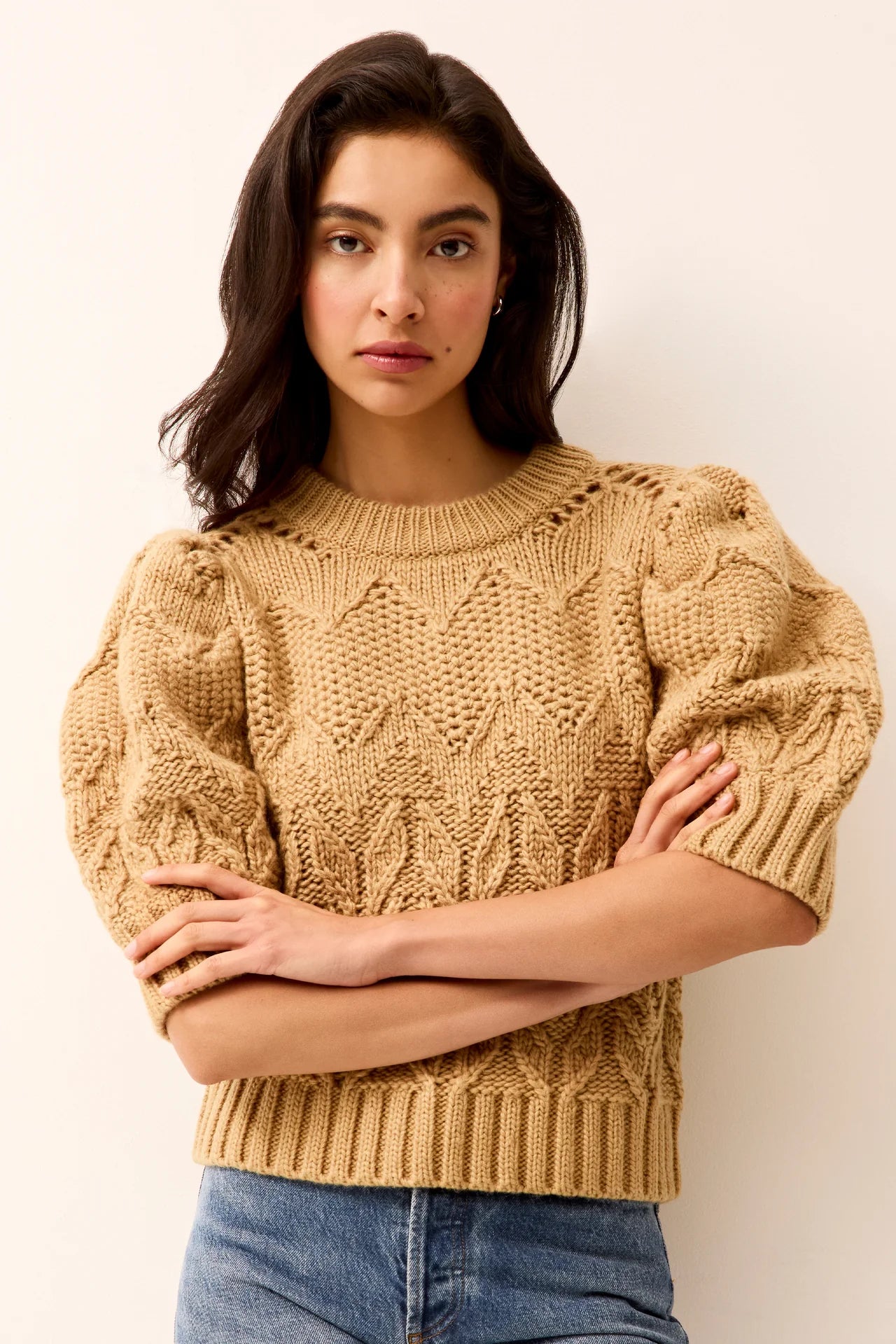 A feminine take on classic cable knit, our short-sleeve Vayda sweater features sculptural puff sleeves and a fitted waist. The updated knit delivers timeless wear-everywhere style, especially in this warm Sesame neutral that pairs particularly well with your favorite denim.