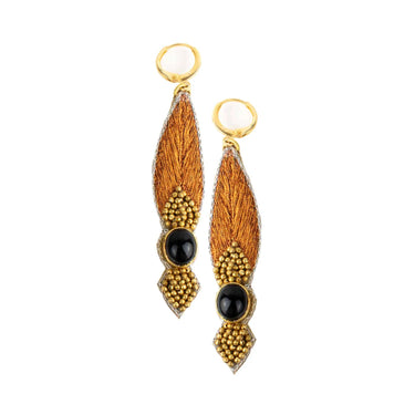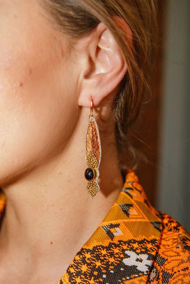 Earrings hand-embroidered with silk thread, set with a semi-precious stone and brass beads. Leather lining, stainless steel and anti-allergenic brass fasteners.