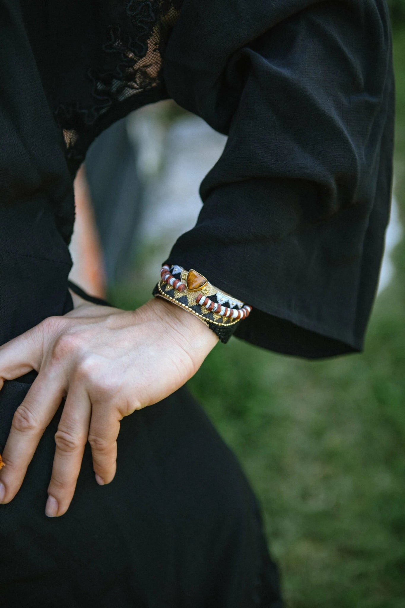 Hand-embroidered bangle in leather and silk thread set with a semi-precious stone and brass beads. Leather lining, adjustable by pressure.