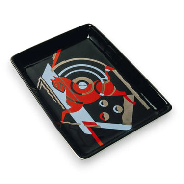 This striking 5" x 7" tray features a bold Art Deco-inspired stallion design in vibrant red and blue tones, accented with shimmering gold foil details. Set against a sleek black background, the dynamic composition evokes strength and movement, making it a stunning statement piece. Perfect for holding jewelry, keys, or small treasures, the Deco Stallion Tray blends elegance and modern artistry, adding a touch of sophistication to any space.