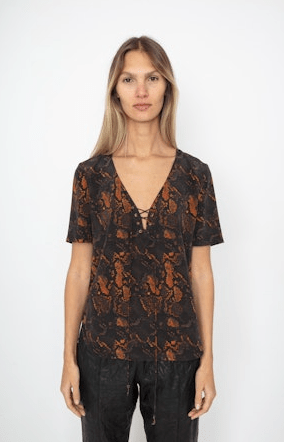 Slip into effortless cool with the Zadig & Voltaire Terzo Top in Python. This statement piece features a striking python print that turns heads while the relaxed silhouette keeps things breezy and comfortable. Perfect for layering or wearing solo, it's the kind of top that makes getting dressed feel like an adventure. Pair it with your favorite jeans or dress it up for a night out—this versatile essential works harder than it looks.