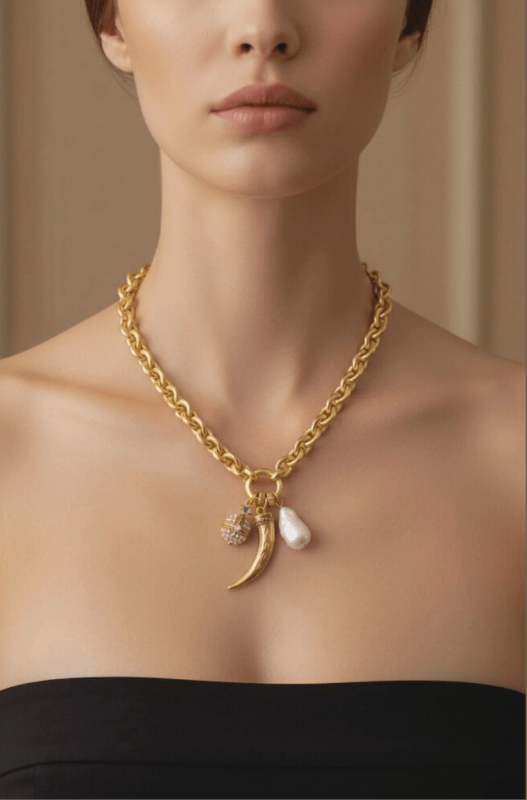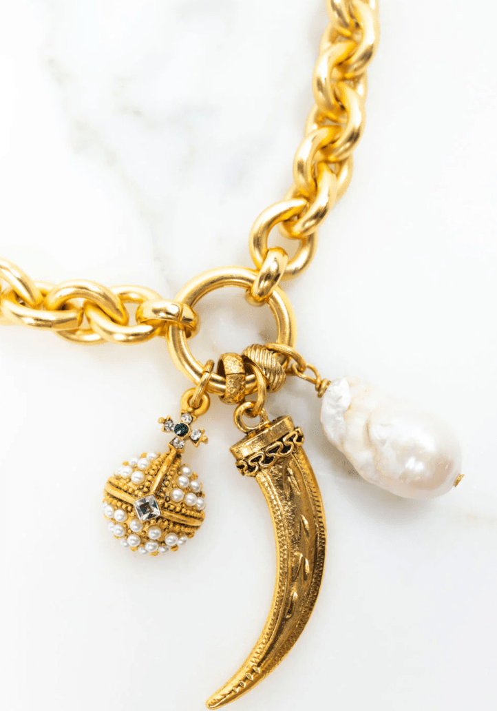 The Kaiden Necklace boldly blends striking elements with elegance. Featuring a large open ring as its centerpiece, it showcases a lustrous freshwater baroque pearl charm, a textured Italian horn charm, and a royal scepter charm lavishly encrusted with faux pearls. Complemented by textured rondelle charms, this daring piece commands attention and adds an edgy sophistication to any outfit.24K Gold Plate, Lobster Claw Closure. Proudly Handcrafted here in the U.S.A.