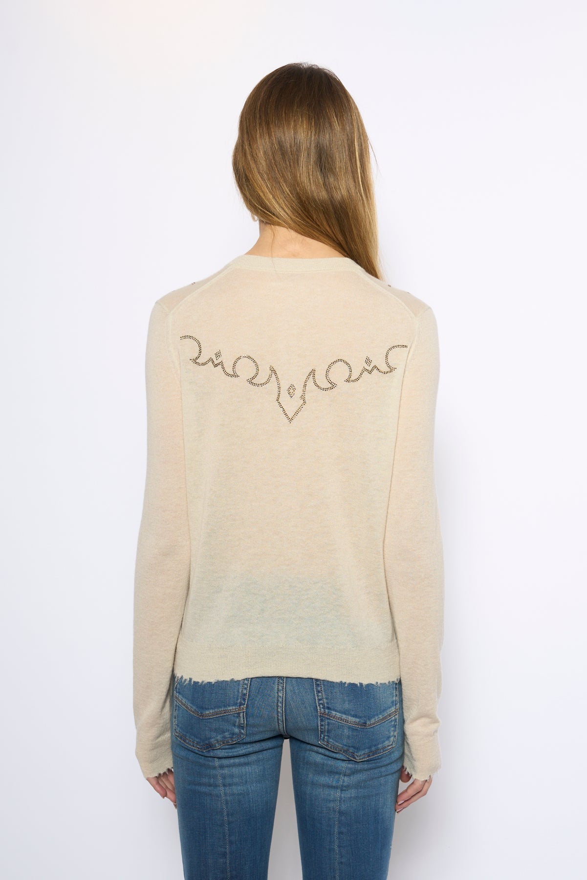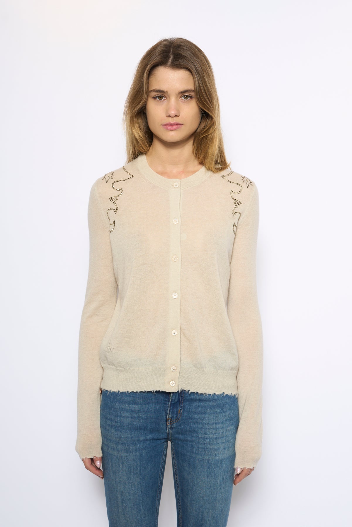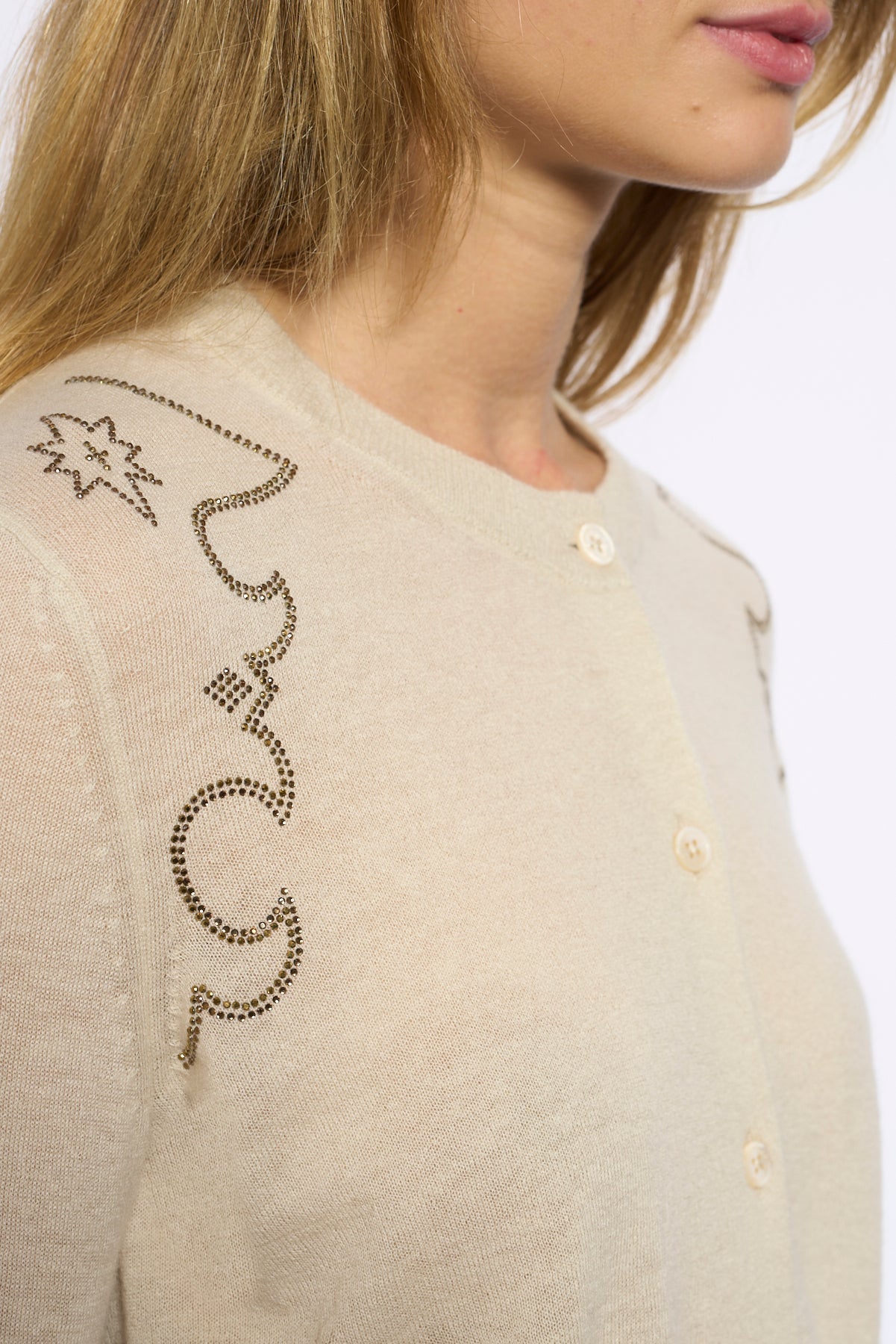 Round neck buttoned cardigan with applied rhinestones.