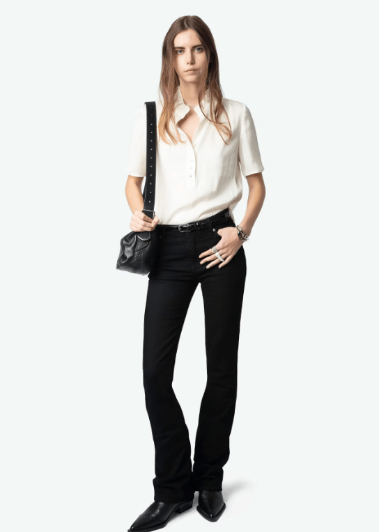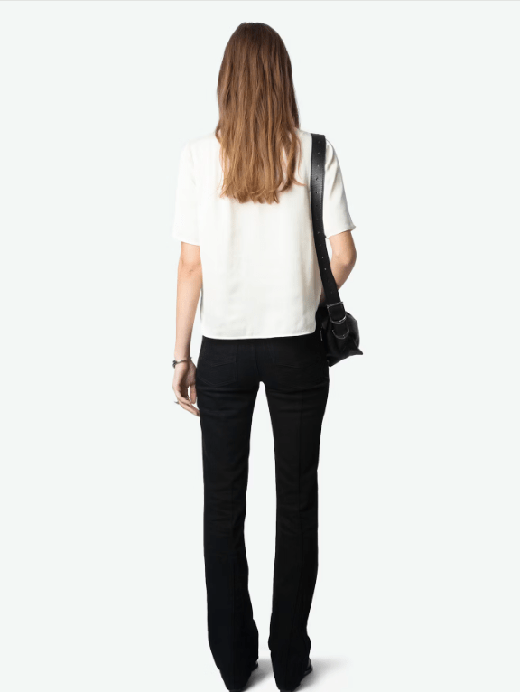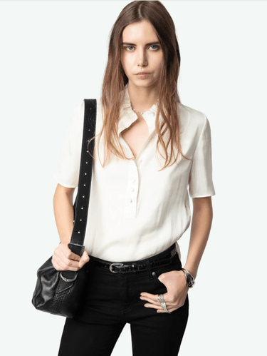 Elevate your look with the Zadig & Voltaire Topher Satin Top in Flake. Its silky satin fabric offers a smooth, luxurious feel, while the subtle flake pattern adds a touch of edgy charm. Perfect for turning heads at any event, this top blends effortless style with a playful vibe that’s both chic and fun. Pair it with your favorite jeans or a sleek skirt for instant cool.