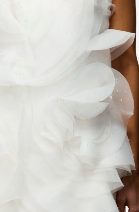 - Exquisite Embellishments: Hand-adorned organza petals, each meticulously detailed with sparkling clear crystals, create a captivating dimensional focal point. These delicate yet striking embellishments elevate the dress, offering a luxurious and artistic touch.
