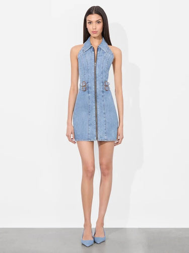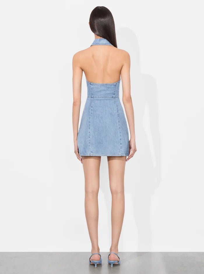 This is not your average denim mini dress. Axelle features a collared halter neckline, fitted silhouette, and bold side buckles you can cinch for a snatched waist moment. Crafted from vintage-wash denim with just the right amount of structure, it’s flirty, fun, and made to turn heads. Style with boots or heels.