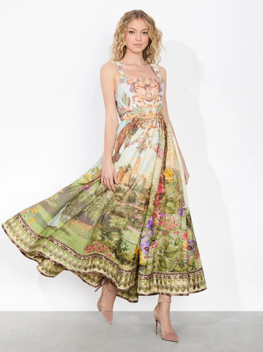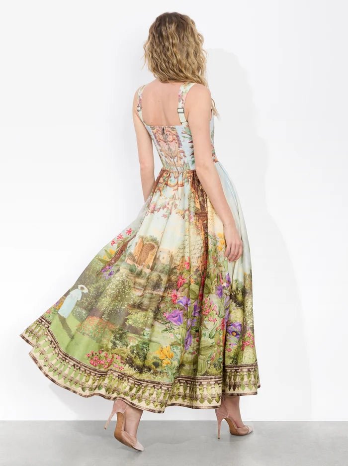 The most romantic print on the dreamiest silhouette - Alice + Olivia Guinevere bustier maxi dress is made for a princess. Crafted in the novel Dusk to Dawn print, this pattern is our reinterpretation of Claude Monet's "Femmes au Jardin" oil painting. Handwritten love letters are layered over our own unique designs to bring the women in his garden to life. Cut from a breezy cotton linen blend, its fitted bustier bodice plumes out into a super feminine A-line skirt. It’s finished with adjustable straps and smocking in the back to conform to your shape. A true stunner that you’ll feel gorgeous and glamorous in. Accessorize it with a spritz and a sunset.