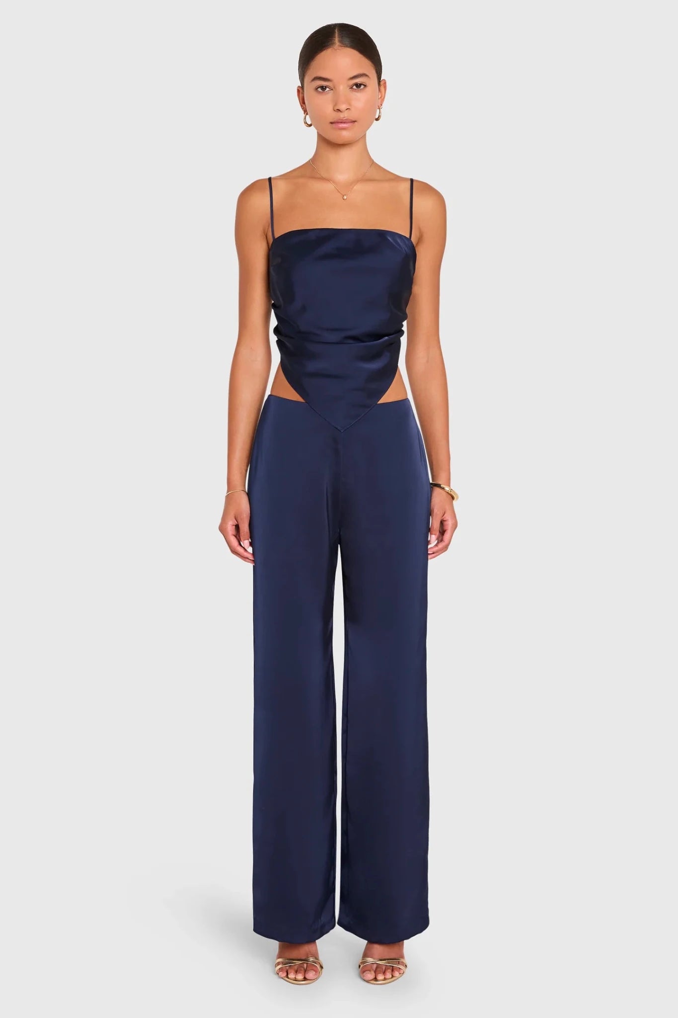 Own the night in the Juna Top. With its lightly ruched bodice and handkerchief-style hem, this versatile piece adds a flirty twist to your going-out look. Pair with the Linda Pants and gold heels for a sleek, standout set.