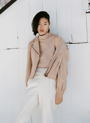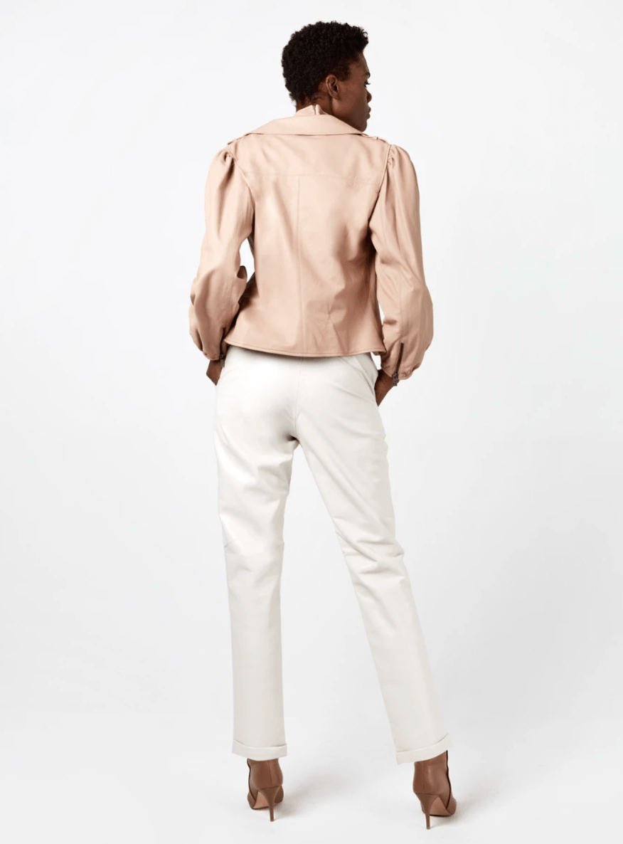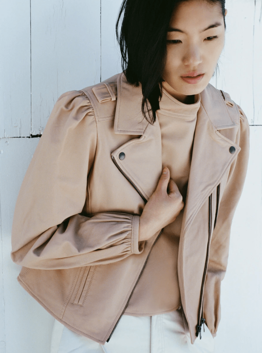 FINAL SALE. Elements of understated femininity and bold biker-chic inspired the design of our Mercury Recycled Leather Jacket. Constructed from our signature recycled leather, Mercury features puff sleeves, oversized lapels, two front zip pockets, and an inner zip pocket for equal parts function and flair.