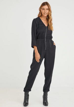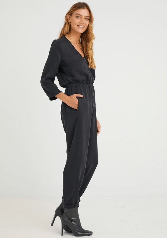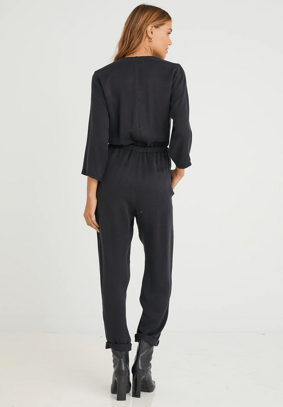 FINAL SALE V-neck 3/4 length sleeve zipfront jumpsuit with gathered waistline and loose-fitting leg.