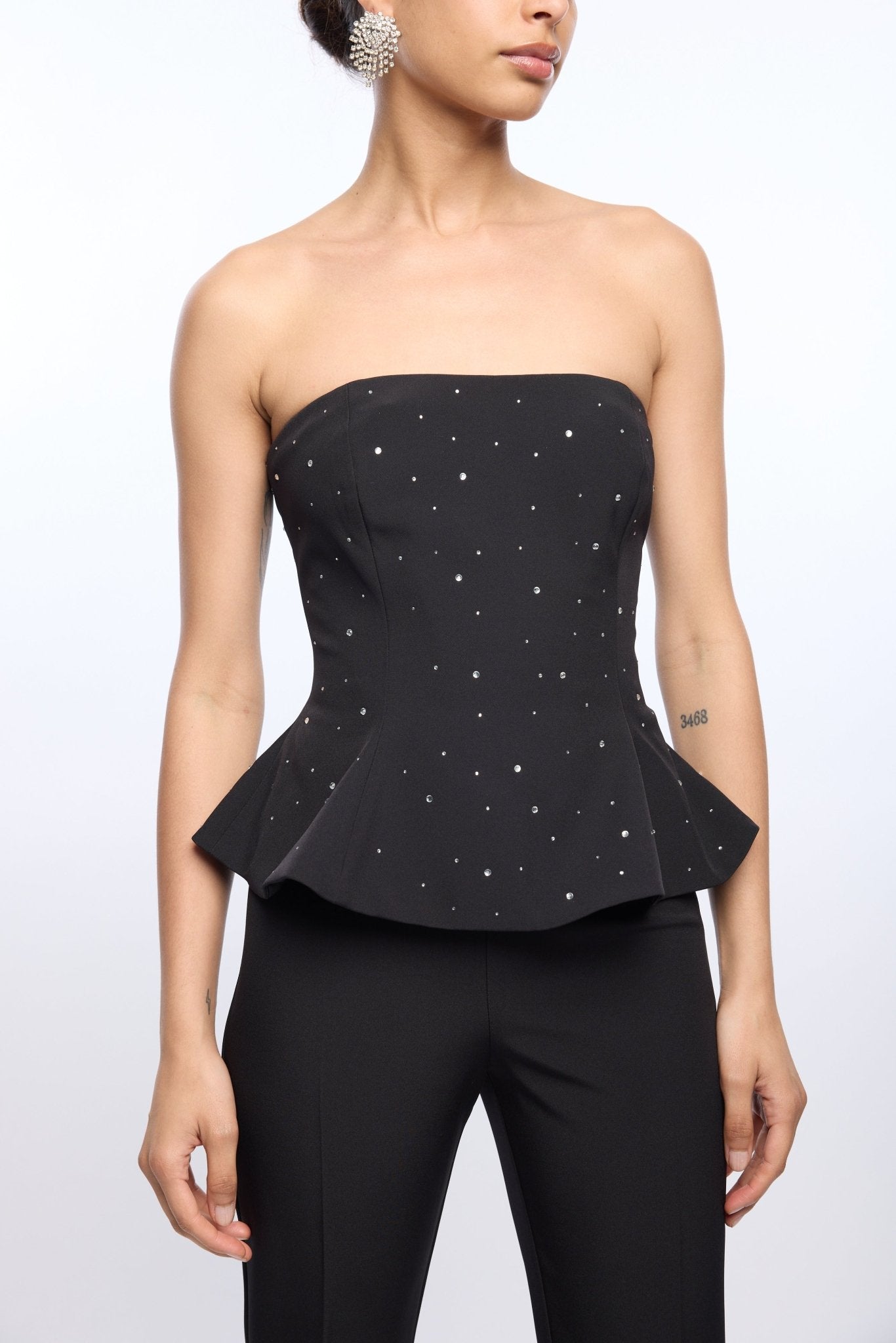 Make a sparkling statement with the Beverly Crystal Crepe Bustier. This strapless silhouette is crafted in sleek black crepe and finished with scattered crystal embellishments for modern glamour. Designed with a flattering peplum hem, it cinches at the waist while offering a polished, feminine shape. Pair it with tailored trousers for cocktail chic or a crystal skirt for a dazzling night-out look.