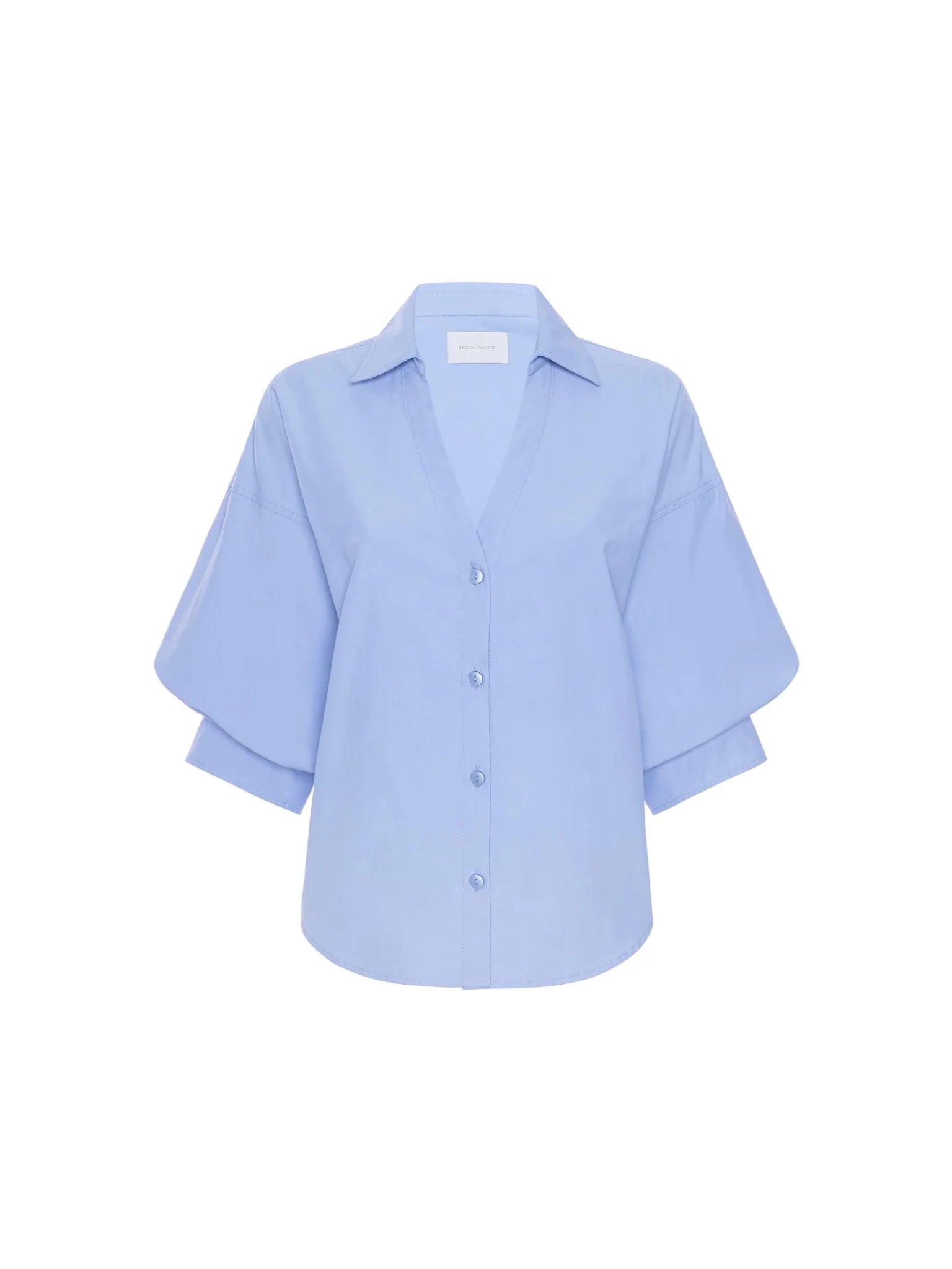 Runs true to size—or size down for a more tailored fit. This relaxed beauty features a collared v-neckline, button front, and those signature blouson sleeves with a playful pushed-up effect that steals the show. Button cuffs and a scooped shirttail hem add feminine flair without trying too hard. The Kate Shirt is your new go-to for effortless sophistication, whether you're tucking it in or letting it flow free. Crafted from a breathable 65% polyester/35% cotton blend, it's the kind of piece that works as hard as you do—from office to weekend brunch. Measurements: sleeve length 25.5" from seam, body length 10.75", chest 41" (size Small). Imported. Model is 5'9" wearing a size Small. Understated elegance with just enough edge.