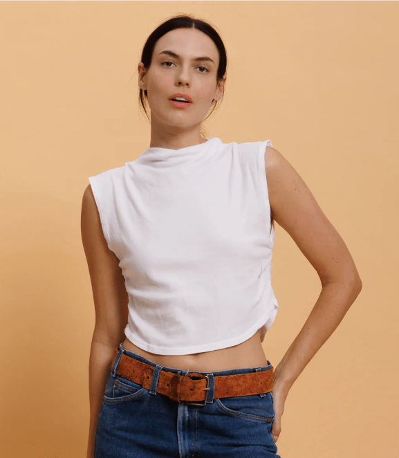 This sleeveless mock neck top with subtle ruching details, perfectly styles with any choice of bottom. Fabricated in our new, ultra soft 100% Organic Cotton Jersey, the Miro top feels like a second skin.