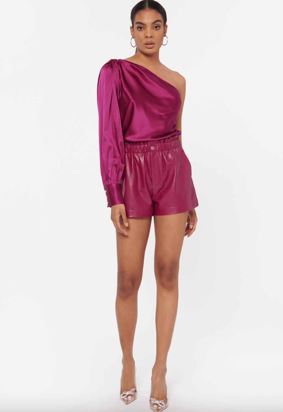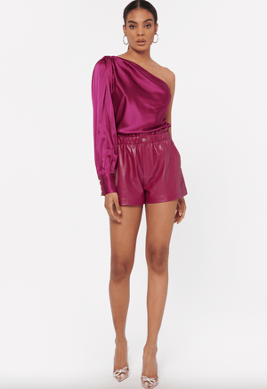 FINAL SALE Constructed from a silk stretch sandwash charmeuse, the Violette Bodysuit is a comfortable and effortless fit. The asymmetrical draped neckline adds a sophisticated touch to a one-shoulder long sleeved style. The Violette is finished with a functional cuff with pearl buttons and pleats at the shoulder top to create a romantic draping effect. Now available in Beetroot, a saturated ruby red with magenta undertones.
