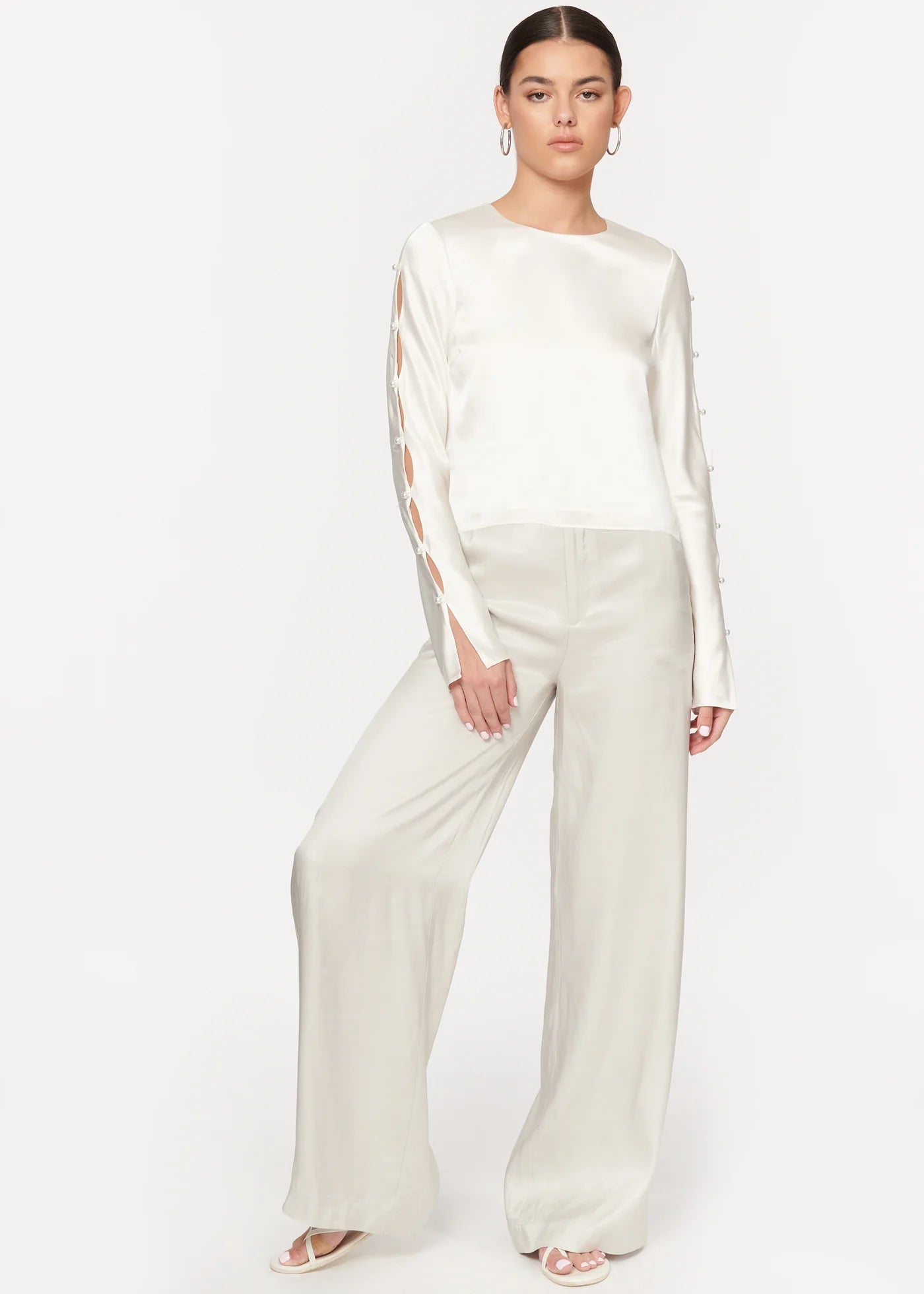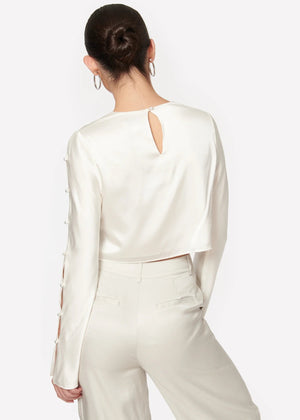 FINAL SALE This crew neck long sleeve is truly one of a kind. The Tatiana Top is a silk blouse featuring slits at sleeve outseam with pearl connectors - elevating a basic blouse. The perfect transition into Spring, the Tatiana is here with a center back keyhole closure. This silhouette is fully lined.
