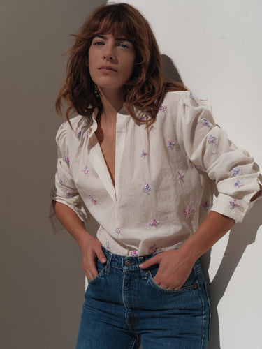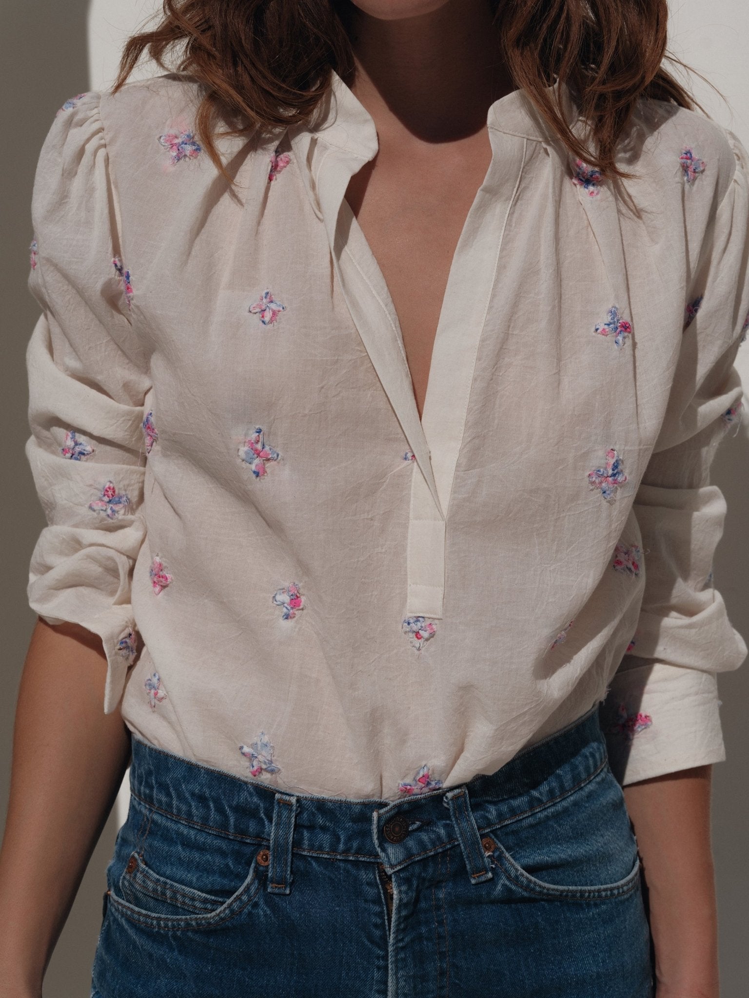 FINAL SALE. A pullover shirt with gently puffed shoulders and subtle shirring.