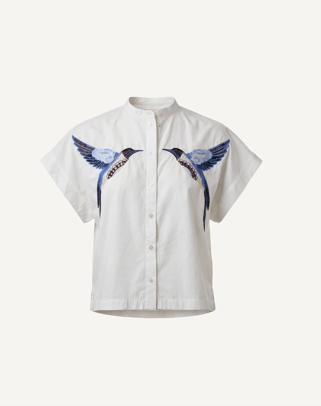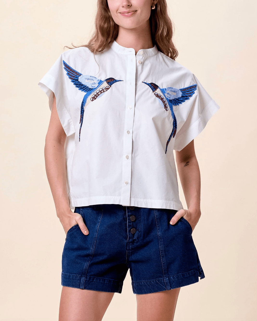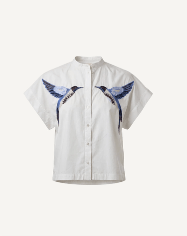 - Feminine Details: The Ariel Blouse features a delicate embroidered bird motif on the front, adding a unique and charming touch. A subtle pleat at the back enhances its graceful drape.