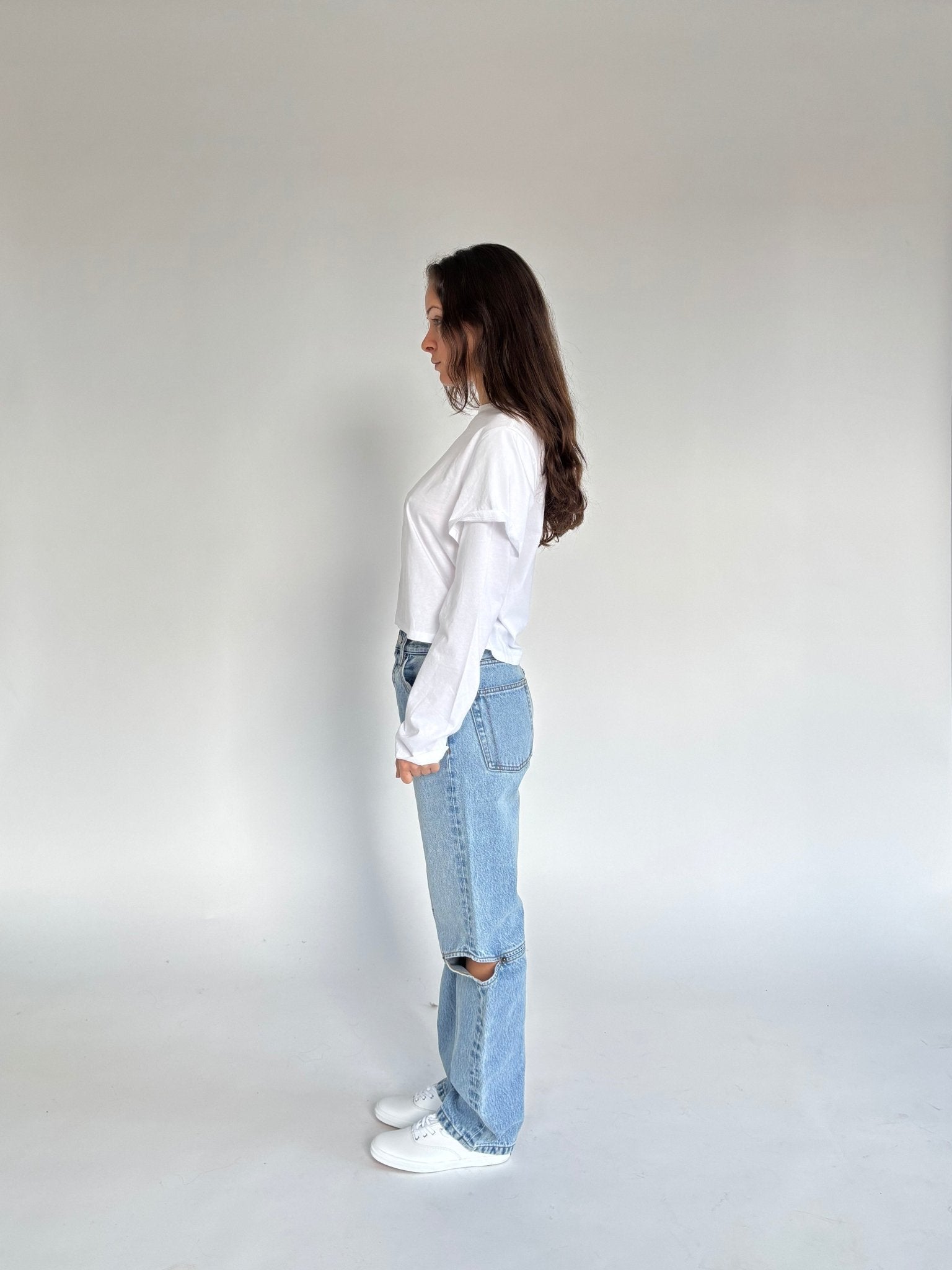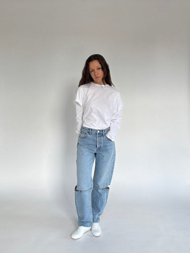 The Cowgirl Jean is inspired by horseback riding cowgirls of the late 19th century. This jean features an inward angled leg and diamond cut-outs on the side knee. These cut-outs are secured with our custom rivet hardware. It features a classic button fly, custom hardware and our signature 'SH' embroidery.