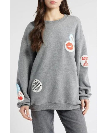 Show off your playful side with our Daydreamer Love Patches BF Crew! This cozy heather grey sweater features charming patches for a touch of quirkiness. Perfect for adding some fun comfort to your wardrobe.