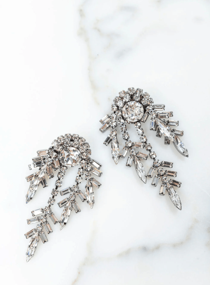 The Claribel Earrings feature a refined combination of multi-shape crystals, highlighted by a round topper with a double halo and elegant leaf dangles. Available in Crystal, Aurora Borealis, Blush, or Purple, these earrings deliver a sophisticated shimmer that effortlessly elevates any look with timeless grace. 24k Gold Plate or Rhodium Plate. Swarovski Crystals. Post Closure. Handcrafted in the U.S.A