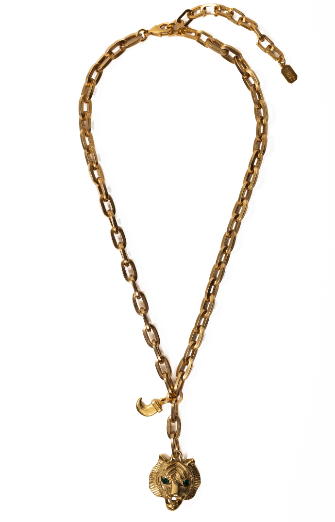 Make a bold statement with the Tarina Necklace, featuring an open link chain anchored by a striking tiger head adorned with vibrant green crystal eyes. This daring piece is completed with a subtle small horn charm, adding a touch of fierce elegance to your look. Perfect for those who want to showcase their confidence and unique style. 24K Gold Plate. Lobster Claw Closure. Made in the U.S.A
