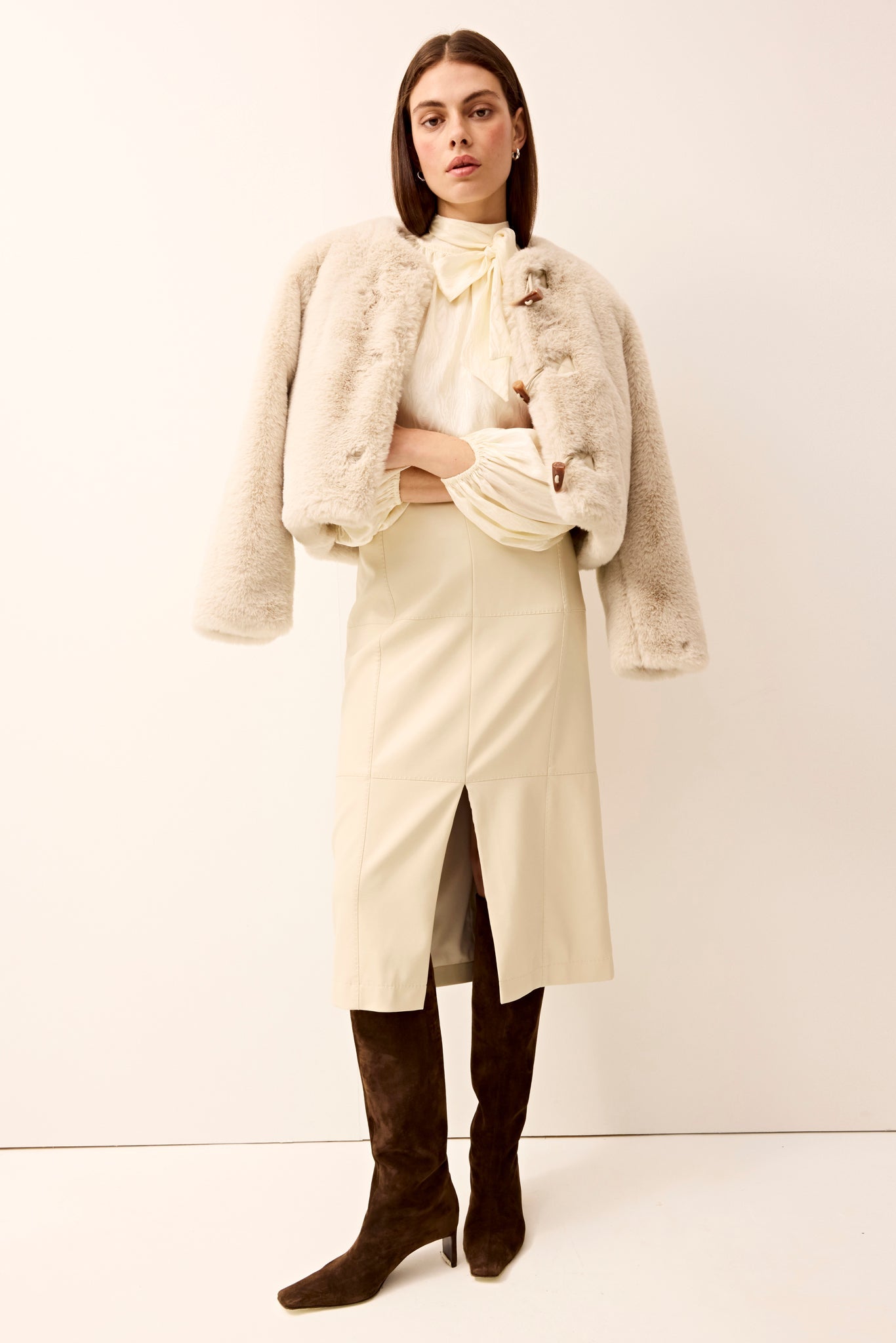The Elliot pencil skirt certainly isn’t just for the office. With a figure-skimming silhouette that’s fitted at the waist and hips, it adds a touch of glamour beyond the canonical 9-5, extending into cocktail hours and special occasions. Outfitted in our neutral Polar colorway, it plays well with the Lonnie sweater in Polar for a luxe layered effect.